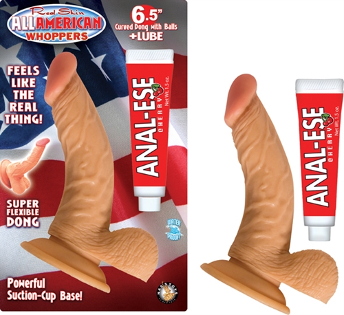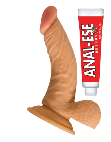 Real skin 6.5-inch flexible dong with balls. Powerful suction-cup base. Harness compatible dong. 1.5 oz. flavored Anal-Ese lube included.