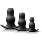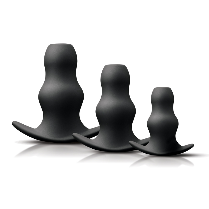 “Look who’s gaping now! An exhilarating addition to anal play, Peekers are ideal for the adventurous seeker! Kit includes three rippled plugs in graduating sizes, each with hollowed center for peephole thrills and playful probing! Made of firm, silky-smooth silicone with flared base for secure wearability. Suitable with all lubricants.”