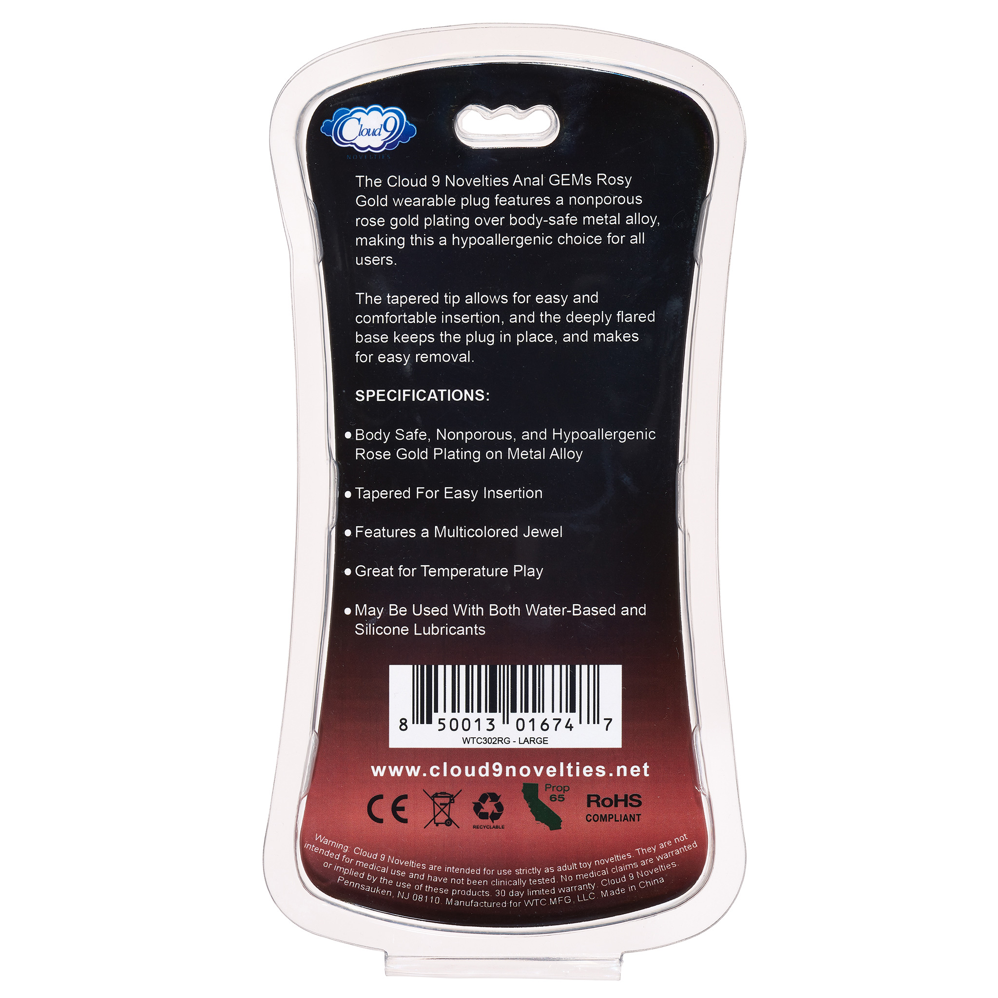 The Could 9 Novelties Anal Gems Rosy Gold wearable plug features a nonporous rose gold plating over body-safe metal alloy, making this a hypoallergenic choice for all users. The tapered tip allows for easy and comfortable insertion, and the deeply flared base keeps the plug in place and makes for easy removal.