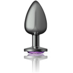 Large, gunmetal, teardrop shaped anal plug with sparkling deep purple colored, round acrylic gemstone. Hypoallergenic, nonporous, body safe, nickel free, aluminum alloy, anal jewelry compatible with all lubricants. Easy to clean and diswasher safe butt plugs.