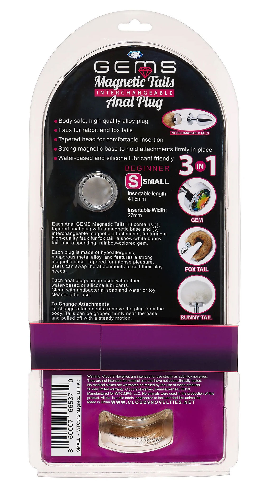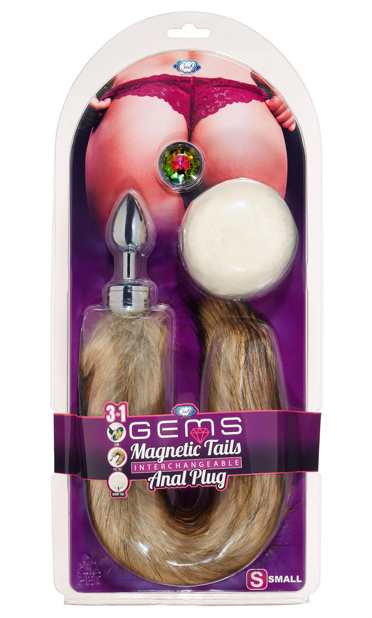 Cloud 9 Anal Gems Magnetic Tails Kit with 3 Interchangeable Attachments. Each Anal Gems Magnetic Tails Kit contains 1 tapered anal plug with a magnetic base and 3 interchangeable magnetic attachments – including a high-quality Faux fur fox tail, a Snow White Bunny Tail, and a Sparkling, Rainbow Colored Gem.