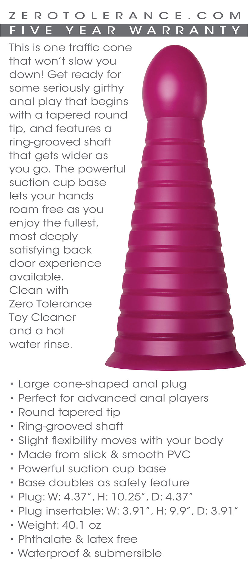 This is one traffic cone that won’t slow you down! Get ready for some seriously girthy anal play that begins with a tapered round tip, and features a ring-grooved shaft that gets wider as you go. The powerful suction cup base lets your hands roam free as you enjoy the fullest, most deeply satisfying back door experience available.
