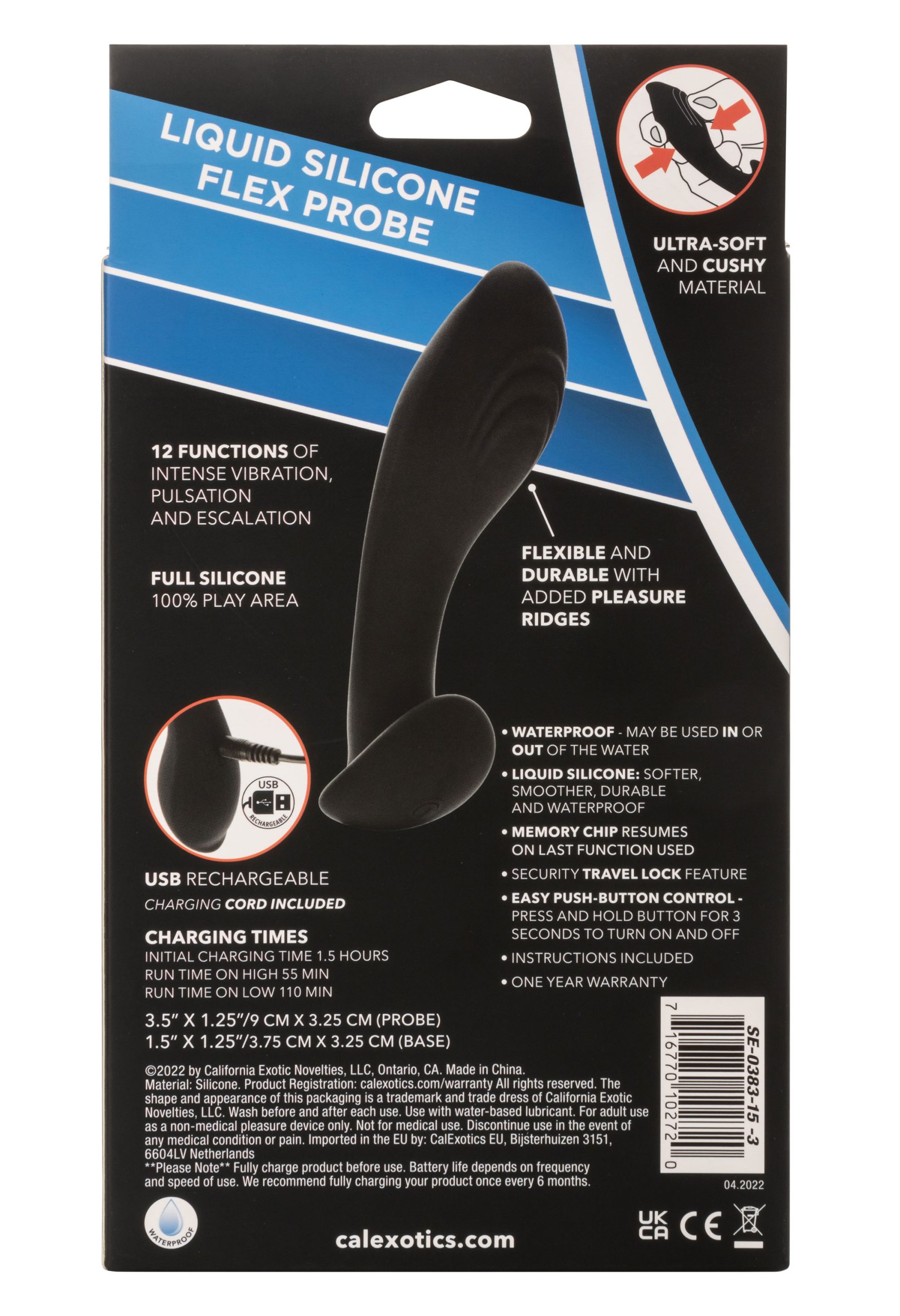 The Eclipse Liquid Silicone Flex Probe is a sexy, flexible silicone probe created to ease you into thrilling anal pleasure. The gently curved design and plush liquid silicone allow this probe to flex with your movements and deliver intense stimulation. This sensually ribbed probe is made from an extra soft silicone for uniquely comfortable pleasure play. A powerful vibration motor in the shaft delivers 12 intense functions of rumbling backdoor stimulation, while the contoured base and pliable body flexes and moves during even your most X-rated moments. Enjoy comfortable insertion, effortless stimulation and gentle removal with the ergonomic shape, flexible design and curved base. Recharge the premium liquid silicone massager in 1.5 hours with the provided USB charging cable to enjoy 110 minutes of low-speed stimulation or 55 minutes of high-speed vibrations. While the easy button controls the intensity and the plump probe gives you the stimulation you want, the integrated state of the art memory chip remembers just how you like it by starting on the last function used.