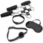 Designed to deliver total sensory deprivation, this bondage kit is the ultimate in role-play and restraint. The set includes two pairs of adjustable, padded cuffs with quick release clips and a satin blindfold with a ball gag to ensure all eyes are on you. A center 4-way connector allows for an effortless hogtie. This bondage accessory is perfect for keeping you in control. The ball gag makes sure they don’t speak until you give permission.