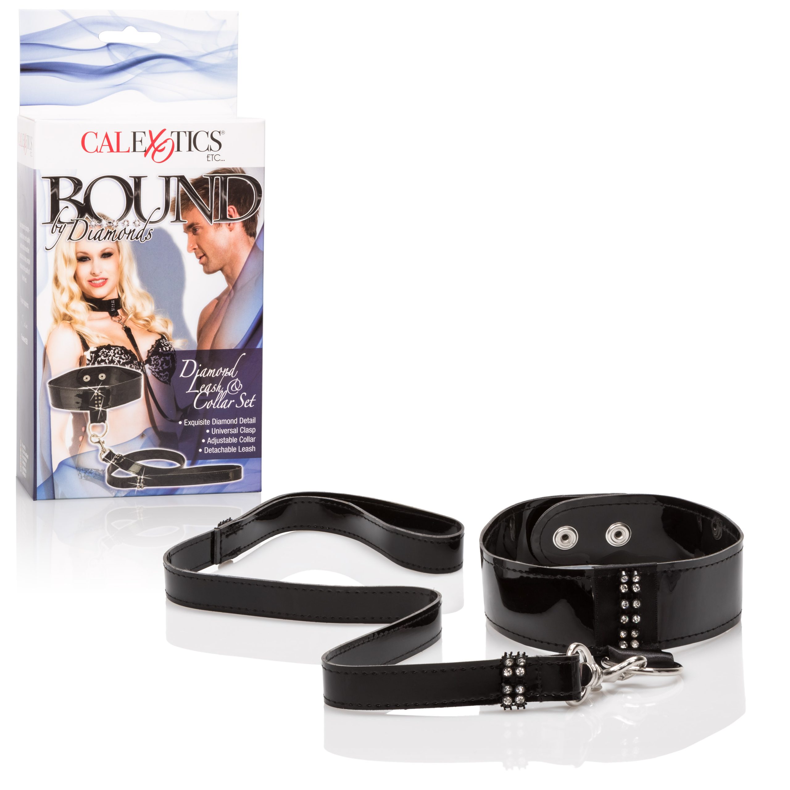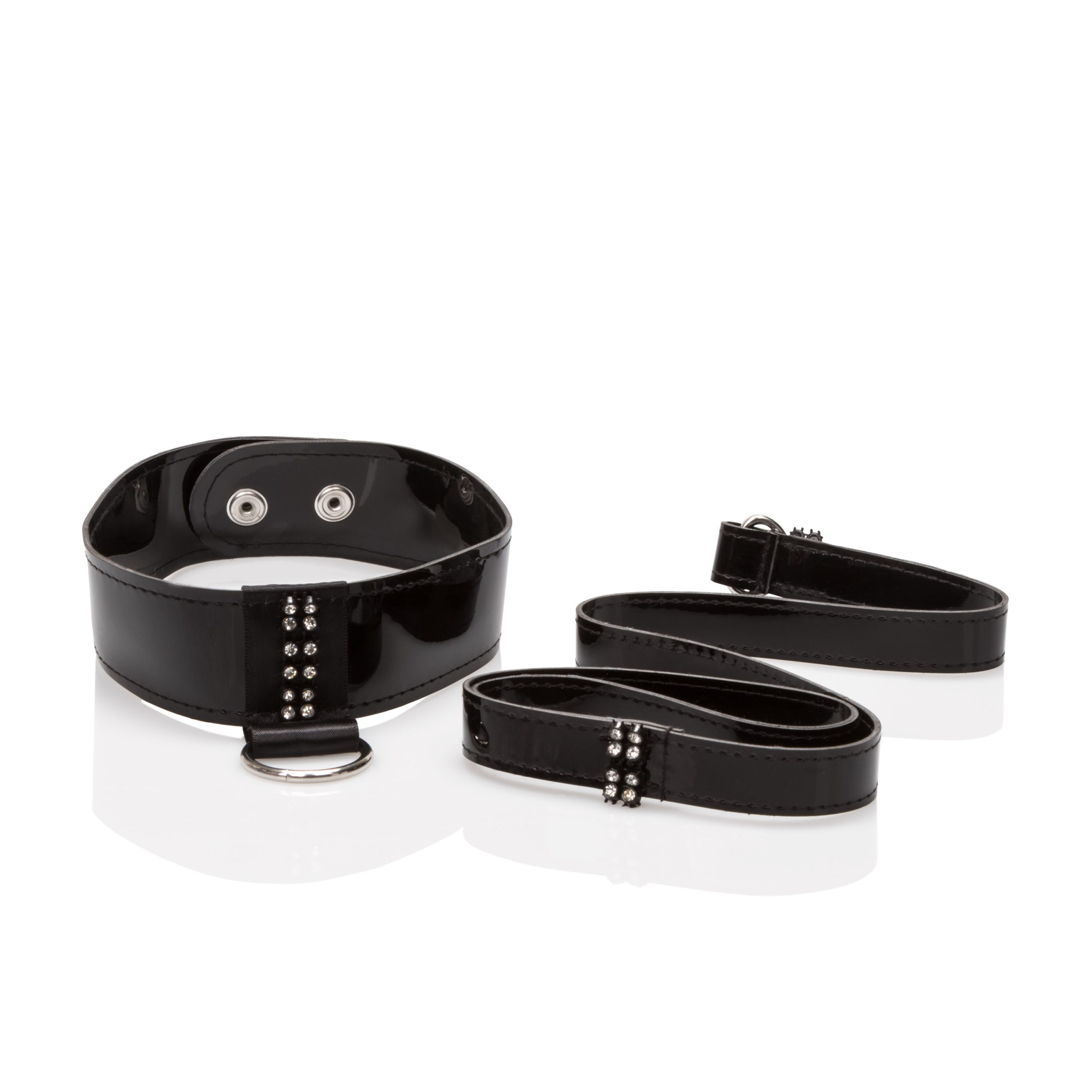 An exquisite collection of seductive fetish gear hand-crafted in soft supple patent leather then adorned with lustrous white crystals. Seductive adjustable 2-snap collar with detachable leash and universal clasp