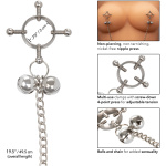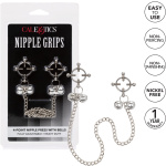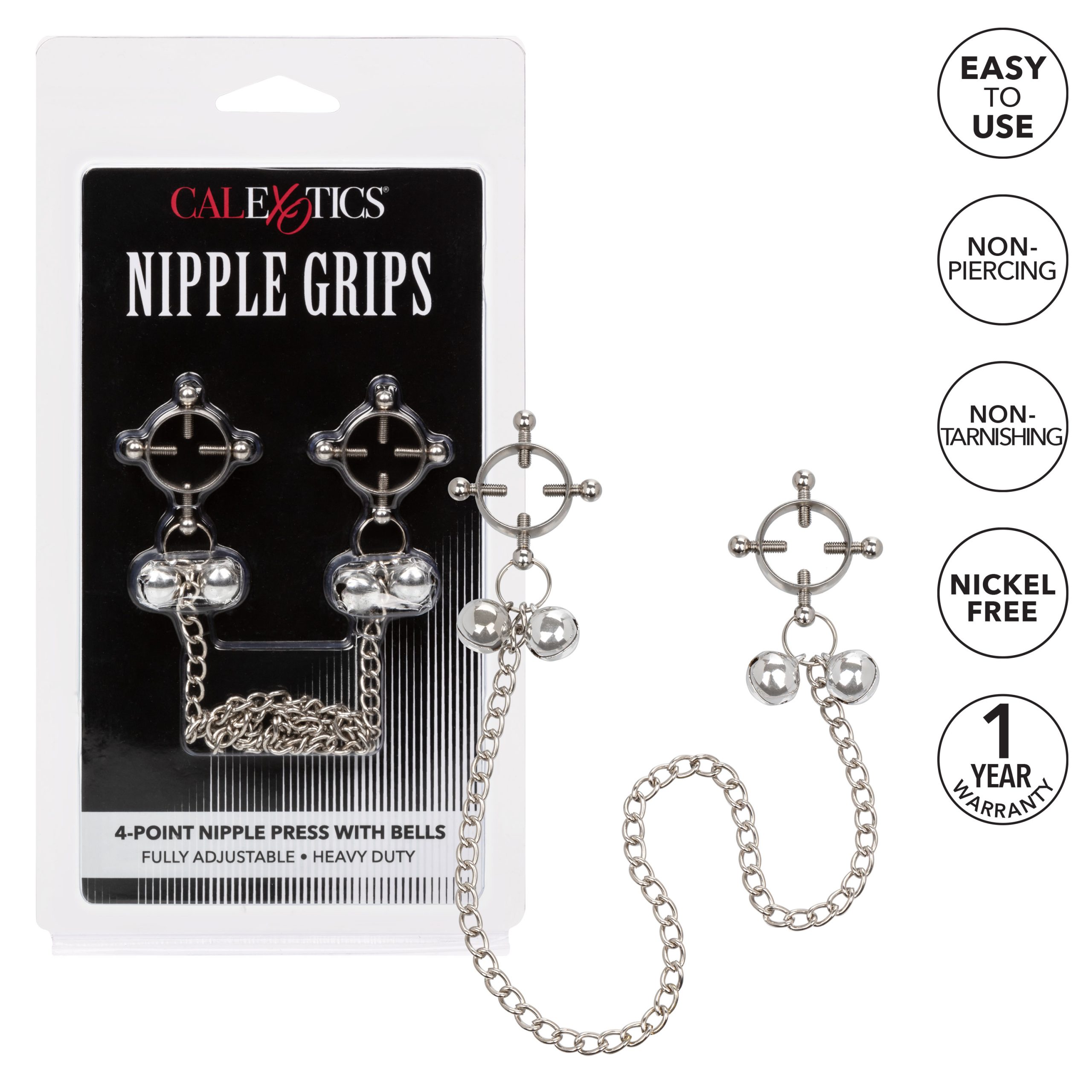 Add some fun to your sex life with the Nipple Grips 4-Point Nipple Press with Bells. Heighten your nipple play with a simple twist of the screws. Tighten the screws to exactly the pressure you desire, and pull on the chain for a satisfying tugging sensation with the bells ringing with pleasure.