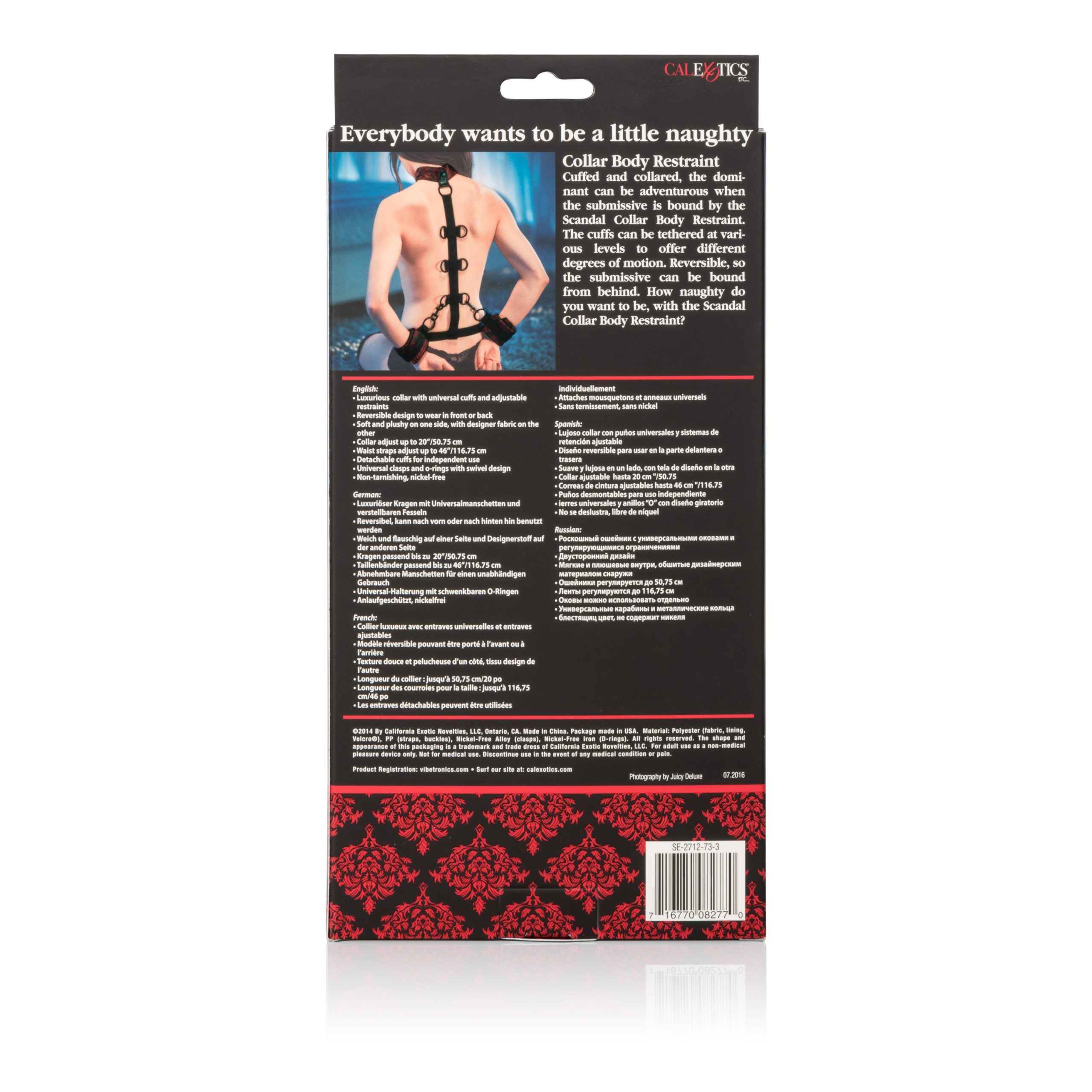 Luxurious collar with universal cuffs and adjustable restraints. Collar adjusts up to 20″/50.75cm. Waist straps adjust up to 46″/116.75cm. Reversible design to wear in front or back. Soft and plushy on one side, with designer fabric on the other. Detachable cuffs for independent use. Universal clasps and D rings with swivel design. Non-tarnishing, nickel free. Polyester (fabric, lining, velcro) PP (straps, buckles) Nickel free alloy (clasps) Nickel free iron (D rings)