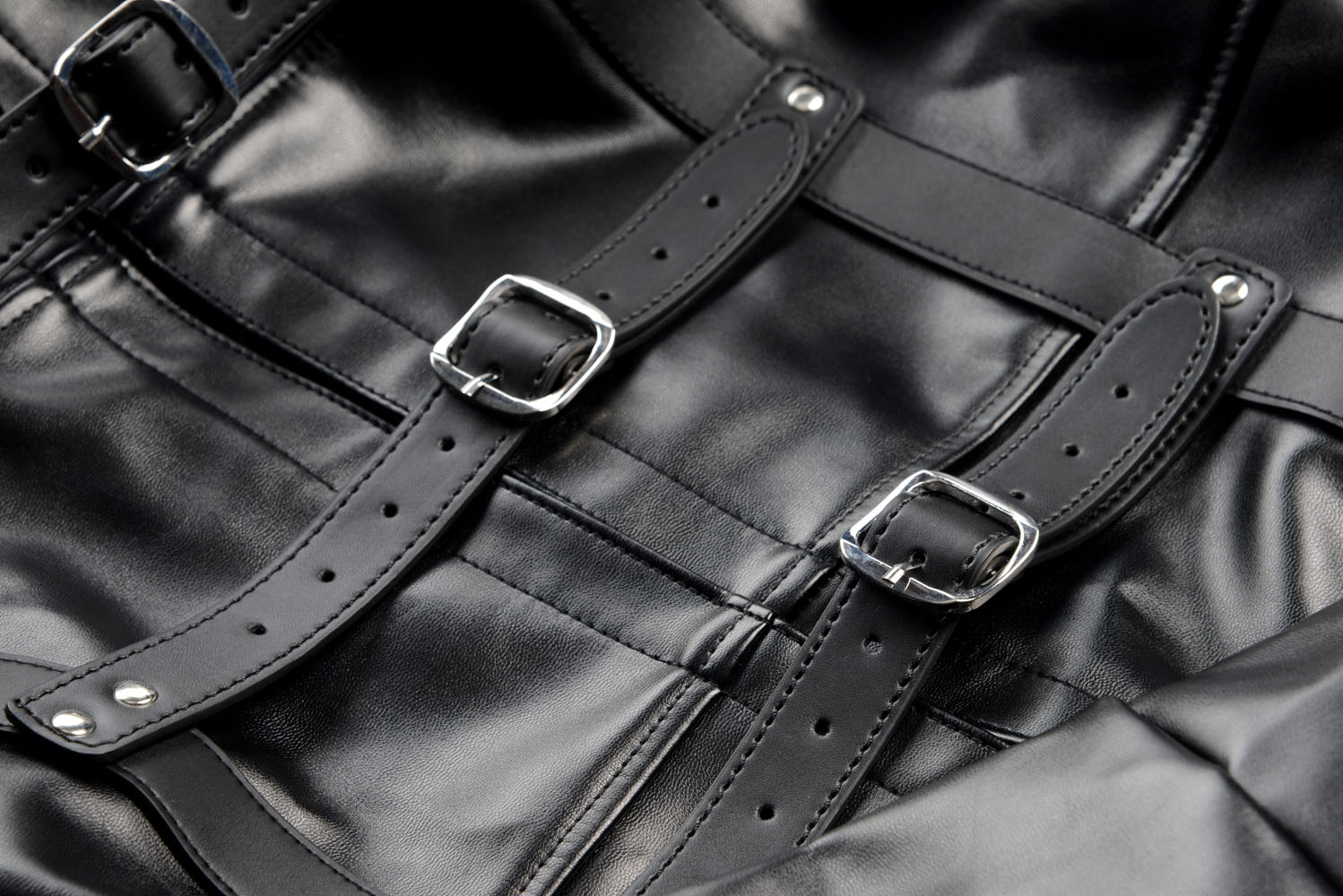 Completely restrain your sub to have your way with them! This unisex straight jacket allows you to trap your plaything with classic medical play fetish wear. Just slip your partners arms into the heavy-duty, leather-like sleeves and tighten the 5 secure buckles up the back. The dual crotch straps provide a tighter fit on both male and female bodies. Cross their arms in front of them and buckle the arm straps together behind them. A final strap wraps around their arms in the front and through loops in the jacket, providing a locking buckle that will keep your submissive completely immobilized until you are done playing with them. An O-ring on the collar allows you to attach a leash or other BDSM accessories. Restrict your sub and make them obey your every bidding!