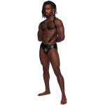 This exotic style features a distinctive leather look stretch fabric, nickel plated studs and rings, full front torso shoulder straps, and an open back.