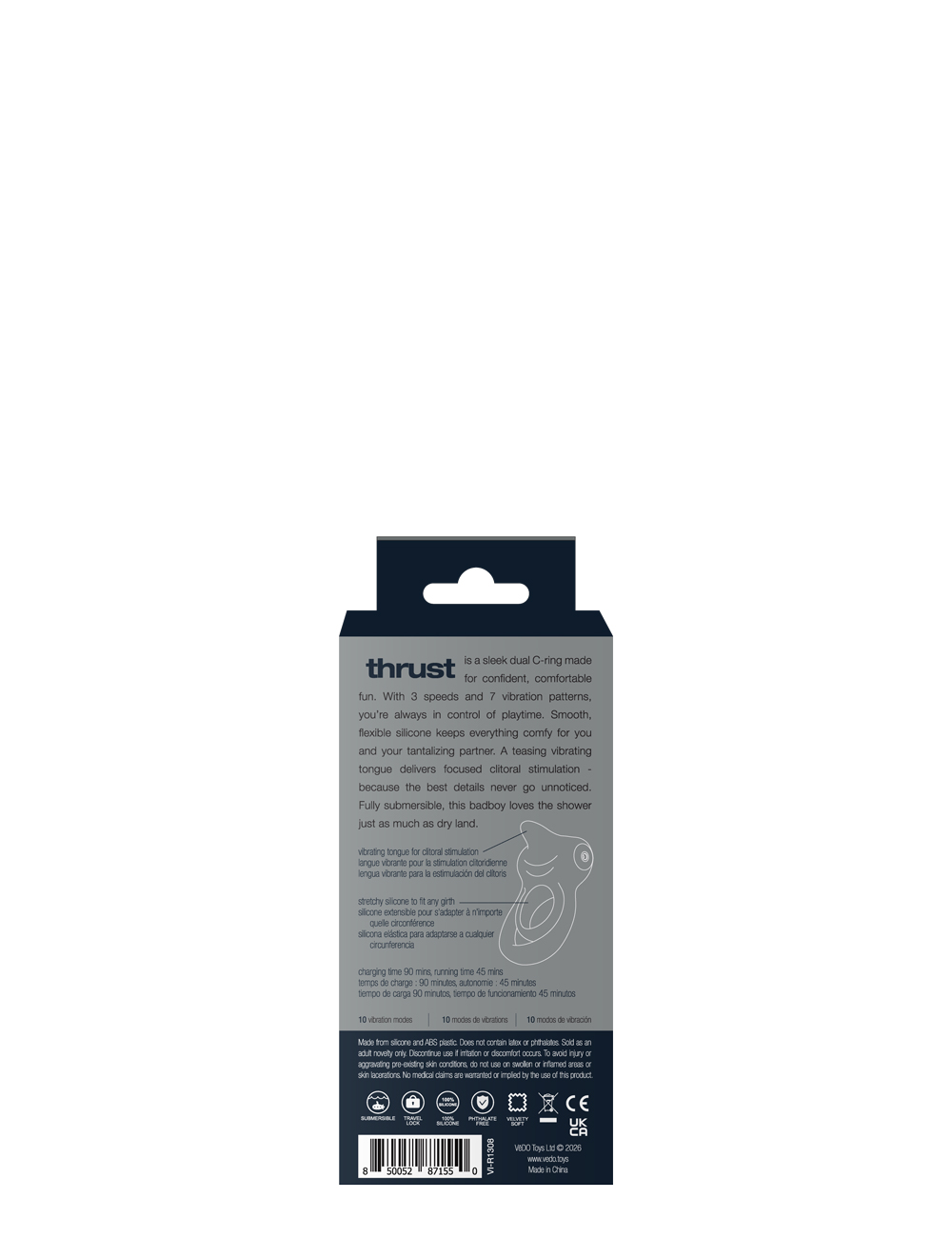 This is a sleek dual c-ring made for confident, comfortable fun. With 3 speeds and 7 vibration patterns, youre always in control of playtime. Smooth, flexible silicone keeps everything comfy for you and your tantaizing partner. A teasing vibrating tongue delivers focused cliroral stimulation because the best details never go unnoticed. Fully submersible, this badboy loves the shower just as much as dry land.