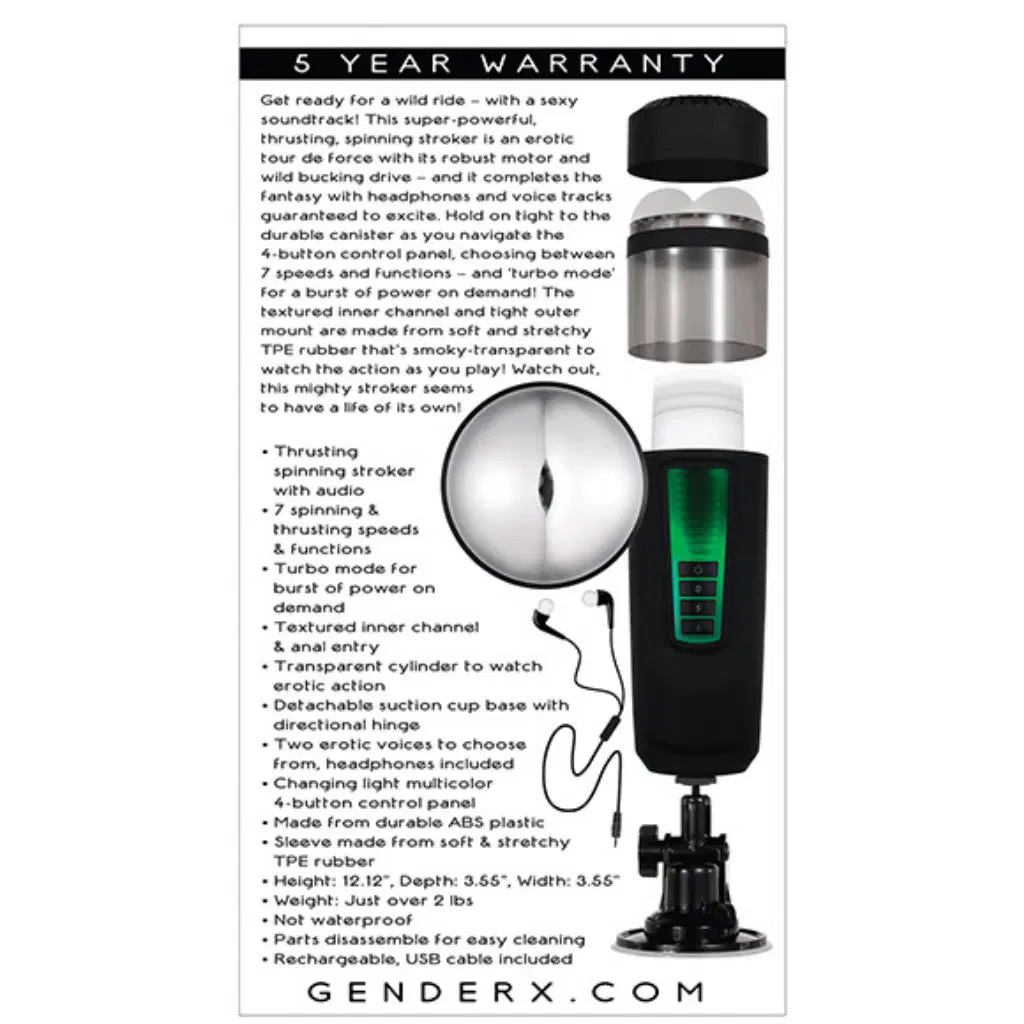 Get ready for a wild ride – with a sexy sound track! This super-powerful, thrusting, spinning stroker is an erotic tour de force with it’s robust motor and wild bucking drive – and it completes the fantasy with headphones and voice tracks guaranteed to excite. Hold on tight to the durable canister as you navigate the 4-buttons control panel, choosing between 7 speeds and functions – and ‘turbo mode’ for a burst of power on demand! The textured inner channel and tight outer mount are made from soft and stretchy TPE rubber that’s smoky – transparent to watch the action as you play! Watch out, this mighty stroker seems to have a life of its own!