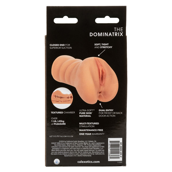 Dive into a world of commanding pleasure with the Cheap Thrills The Dominatrix, an intense stroker designed to take control and deepen your ecstasy. This heavy duty stroker, weighing in at over 1 lb./.45 kg, is expertly crafted from ultra life-like Pure Skin material for a feel that’s both intoxicatingly soft and exquisitely tight. Flexible yet firm, it offers the thrilling option of dual entry, allowing you to choose between front or back door adventures, each path designed to dominate your senses.Inside the Cheap Thrills The Dominatrix, you’ll find a textured chamber that captivates and grips, enhancing every thrust with complex sensations, while the closed end creates a powerful suction that intensifies your climax. Maintenance-free and ready for action, this dominatrix demands nothing but your surrender to pleasure, creating a session where your satisfaction is non-negotiable. Give into the command of The Dominatrix and prepare for an experience that rules your world.