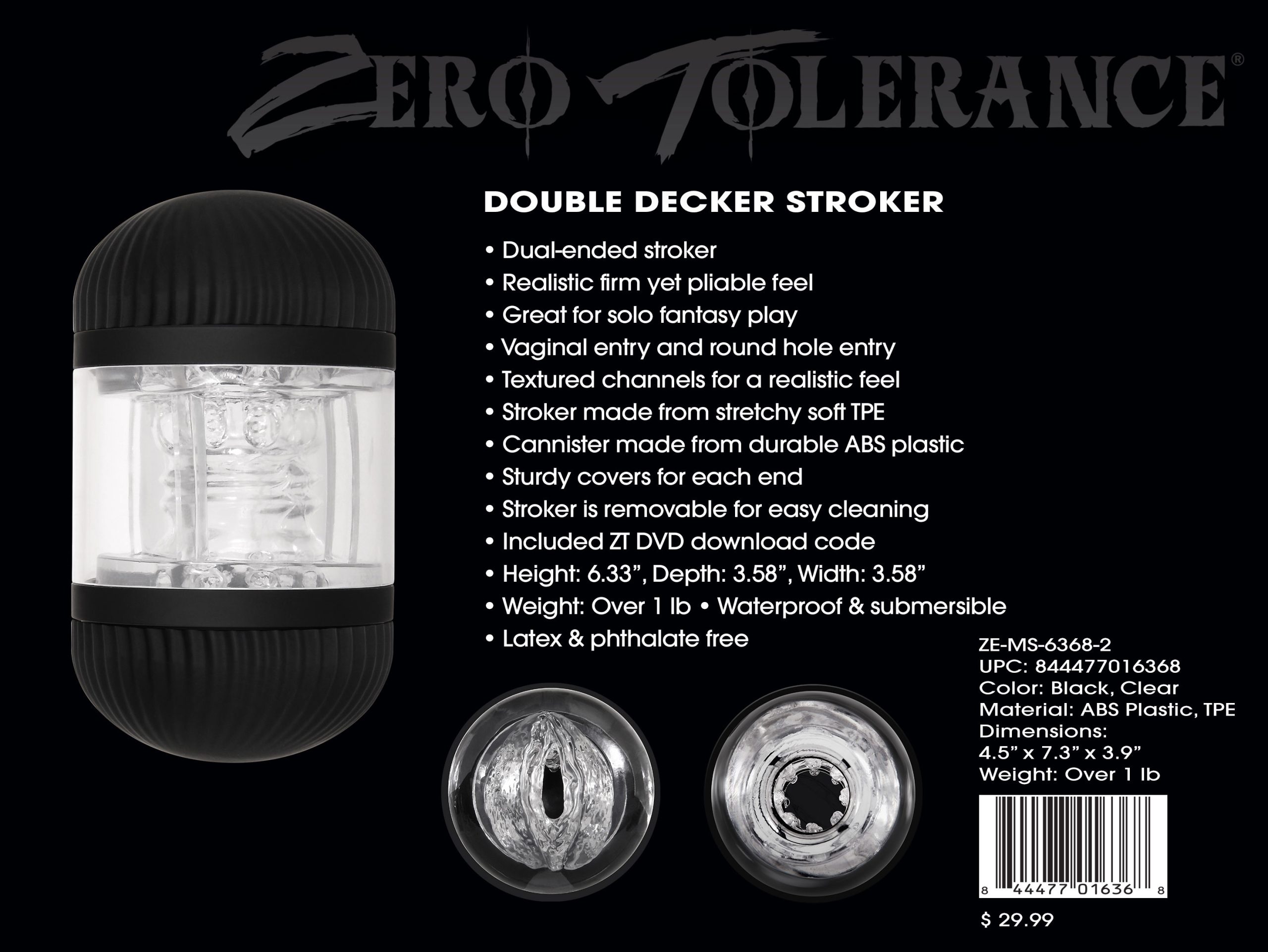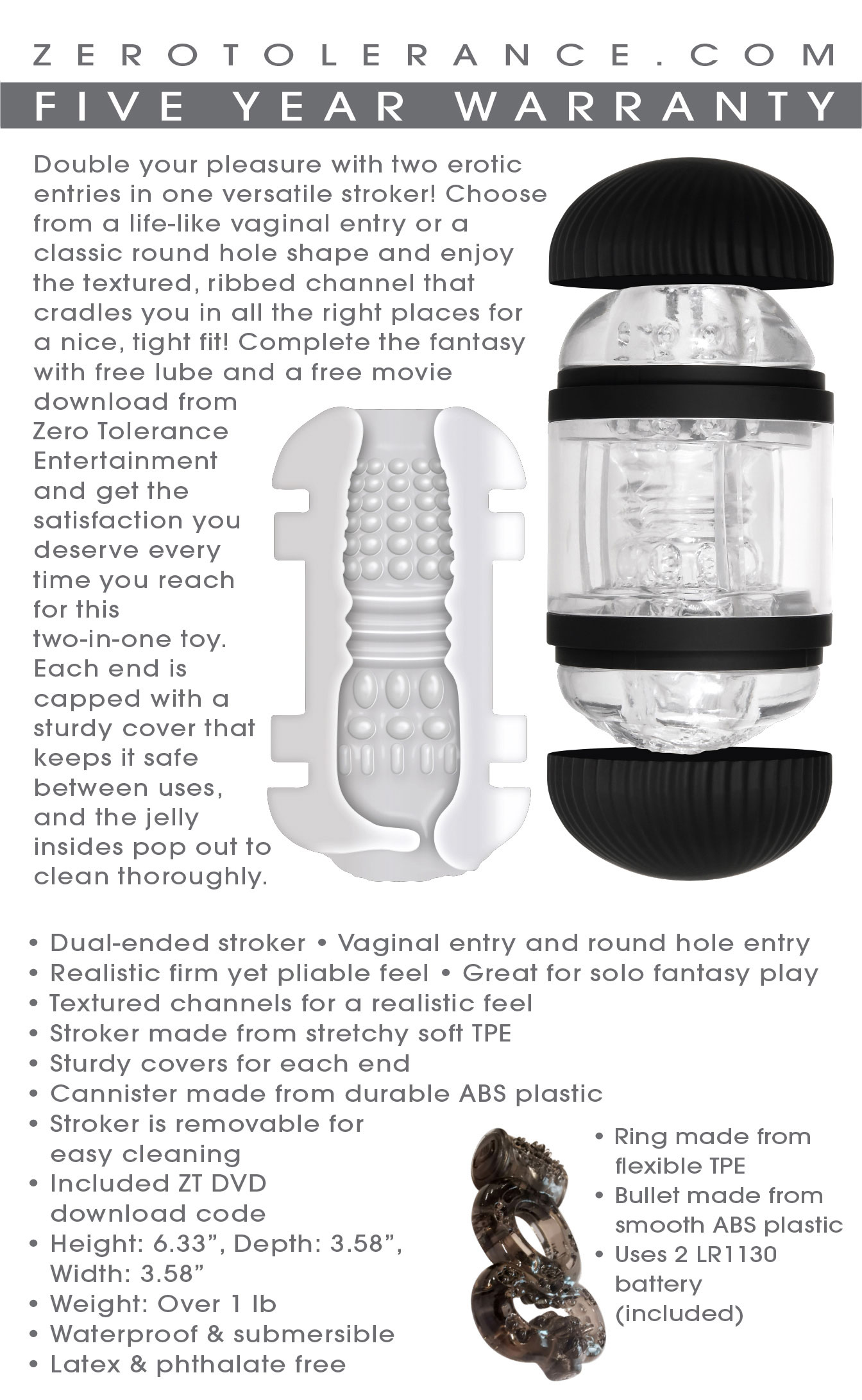 Double your pleasure with two erotic entries in one versatile stroker! Choose from a life-like vaginal entry or a classic round hole shape and enjoy the textured, ribbed channel that cradles you in all the right places for a nice, tight fit. Complete the fantasy with free lube and a free movie download from Zero Tolerance Entertaiment and get the satisfaction you deserve every time you reach for this two-in-one toy. Each end is capped with a sturdy cover that keeps it safe between uses, and the jelly insides pop out to clean thoroughly.