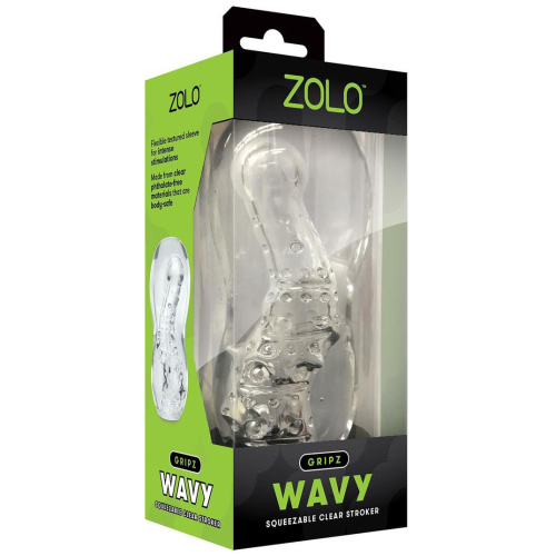 The ZOLO Gripz Collection introduces Wavy, a flexible, textured, squeezable clear sleeve that provides intense stimulations using its unique curved interior shape. Thanks to the ergonomic design, it fits perfectly in your hand. Made from clear phthalate-free materials that are body-safe.