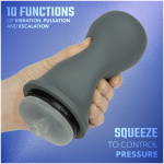 Self-contained rechargeable masturbator with powerful vibrating action. Squeeze to control the pressure. 10 functions of vibration, pulsation and escalation. Removable, ultra-tight, and textured sleeve is close-ended for superior suction. Air release to control suction. EZ grip for a powerful hold. Removable cap for safe and clean storage. Body-safe and waterproof submersible – IPX7. State-of-the-art memory chip resumes on last function used. Security travel lock feature – hold for 3 seconds to turn on or off.