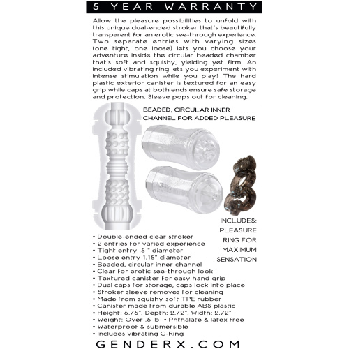 Allow the pleasure possibilities to unfold with this unique dual-ended stroker that’s beautifully transparent for an erotic see-through experience. Two separate entries with varying sizes (one tight, one loose) lets you choose your adventure inside the circular beaded chamber that’s soft and squishy, yielding yet firm. An included vibrating ring lets you experiment with intense stimulation while you play! The hard plastic exterior canister is textured for an easy grip while caps at both ends ensure safe storage and protection. Sleeve pops out for cleaning.