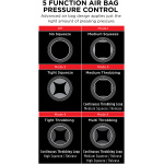 Air Bags: To active the air bag function, press the bottom button once. Press again to cycle through modes. To turn off air bags and release pressure, press hold the bottom button for three seconds.