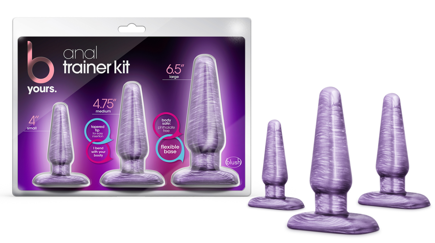 Blush is a sexual health brand committed to the pursuit of pleasure with innovation, education and inclusivity. The mission is to enhance intimacy with thoughtful products designed to celebrate all bodies. Ready to dive into anal exploration? The B Yours Anal Trainer Kit will help your body safely acclimate to larger lengths and girth! Start small and work your way up to large with three, flexible and beautiful plugs. Each plug is tapered for comfortable insertion and is equipped with a strong neck to hold it in place and a flexible base for anal safety. Made with body-safe, smooth PVC, this Anal Trainer Kit is phthalate-free, fragrance free, latex free, and easy to clean! Add some lube and take these gorgeous plugs on an adventure!