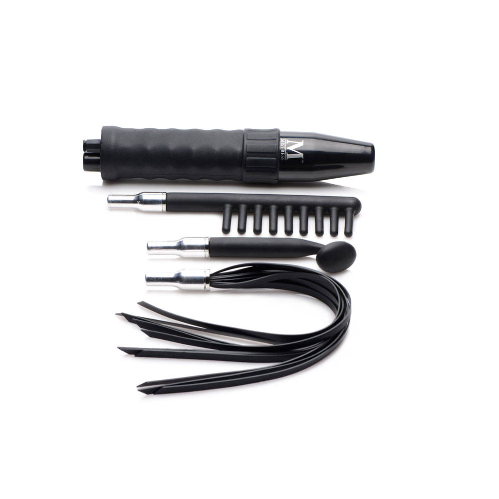 Sizzle the senses with electrosex! This Violet Wand set provides unique and intense sensations with silicone attachments that will not shatter like delicate glass. The mushroom-shaped accessory is ideal for sending pinpoint zaps of electricity into your slave or subs supple flesh. The comb features 9 teeth to transmit the current along a long strip of skin. Finally, the flogger will send a shock into them with every sensual stroke or swinging slap! The actual wand allows you to play with a wide range of power, from tingles to jolts. It features a silicone handle that enables a sturdy grip and a long cord that allows you to move freely around your playspace. Compatible with most violet wand attachments.