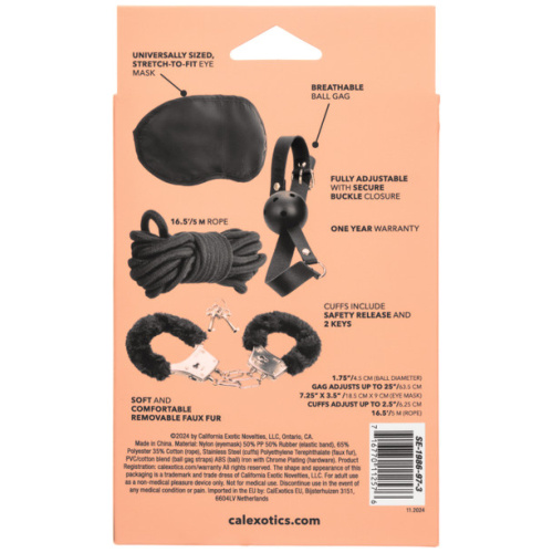 Dive into the unknown with the universally sized eye mask that invites you to surrender your sight and heighten your other senses. The ball gag, designed for both comfort and control, ensures that every moan is muffled to perfection, enhancing the anticipation of every touch. Meanwhile, the plush faux fur cuffs offer a gentle embrace around wrists or ankles, equipped with a safety release and two keys for secure yet thrilling restraint play.