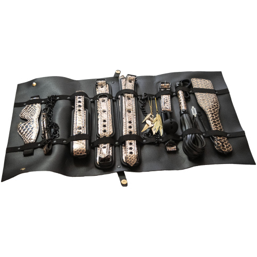 Looking to start your collection of BDSM tools? Look no further with this stylish BDSM fantasy travel briefcase with a set of matching black items with rose gold patterns. The 10 Piece kit includes: Mask, leash, Collar, 2 Wrist Cuffs, 2 Ankle Cuffs, 2 Cuff Chains, 2 Nipple Clamps, Ball Gag, Whip and Paddle.