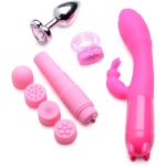 This Passion Deluxe Kit features 4 powerful ways to play! Explore your sexuality and bring your pleasure to new heights with this collection of vibes: a powerful buzzing mini massager, curved silicone rabbit vibe, metal pink heart butt plug, and stretchy cock ring. Use each toy in combination or one at a time! This Deluxe kit is perfect for gifting yourself or others. Surprise your lover during a weekend of passion with a kit designed to elevate your intimate moments.