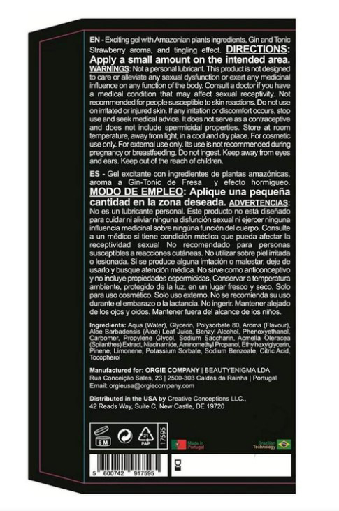 Strawberry Gin and Tonic – Kissable arousal intimate gel with Amazonian plants ingredients and genuine flavor of Gin and Tonic Strawberry. Perfect for couples of any sexual orientation and self-love enthusiasts. Vibrating and tingling effects level 6.