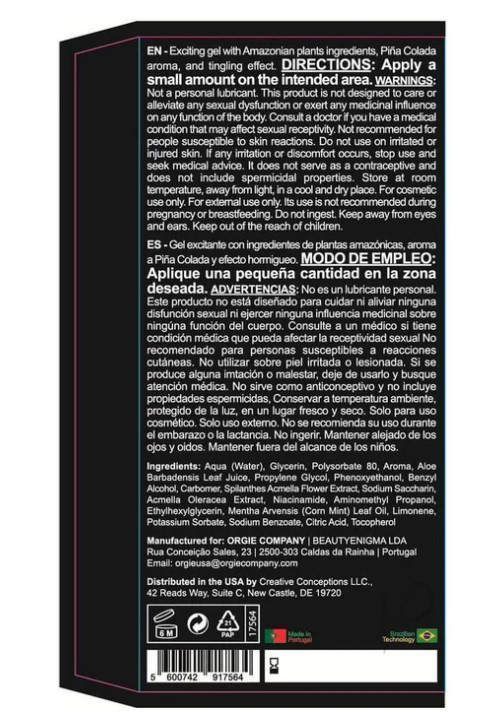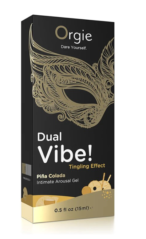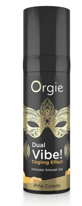 Orgie Dual Vibe Intimate Arousal Gel 0.5 fl oz Pina Colada is inspired by the tropical allure of the classic cocktail, bringing a refreshing and playful touch to your intimate experiences. This kissable arousal gel combines a delicious Piña Colada flavor with a mild but satisfying vibration effect, designed to heighten pleasure during oral sex, intercourse, or self-love. The unique formulation delivers tingling and vibrating sensations that instantly enhance sensitivity, while the sweet cocktail-inspired taste turns intimacy into a truly sensual moment.