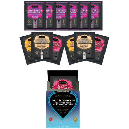 Having a quickie never felt this good with Kama Sutra’s DIVINE NECTARS assorted flavored body glides and LOVE LIQUID water-based lube. Only got a few minutes? No problem! Slip & slide your way from oral play to mind-blowing sex at a moments notice. Water-based and body-safe. Conveniently packaged in single-use sachets for great sex anytime, anywhere.
