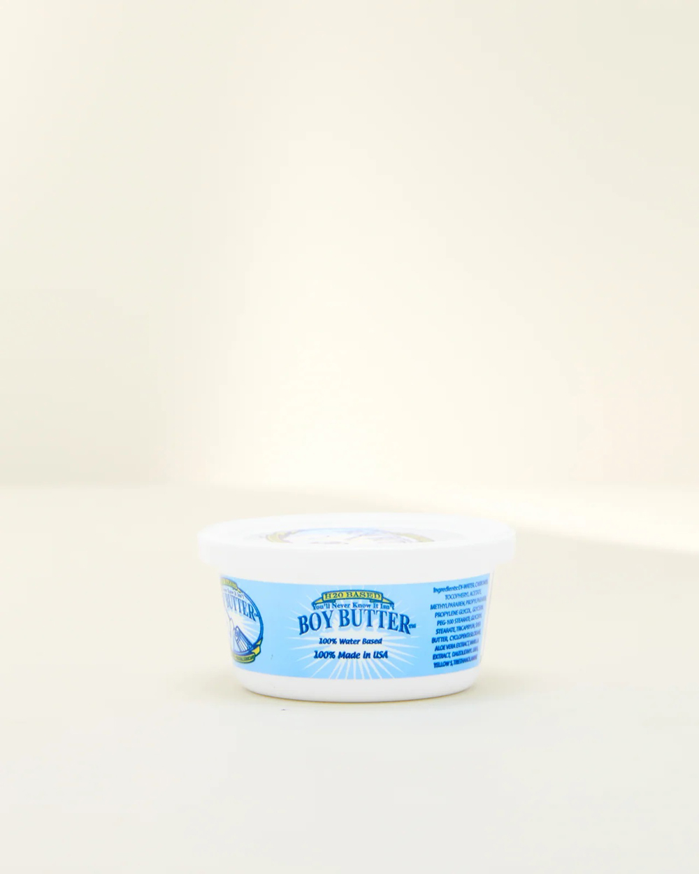 You’ll Never Know it isn’t Boy Butter or Boy Butter H20 is our Water and Vitamin E hybrid cream form lubricant that is safe to use on men, women, and everyone. The formula is creamy and goes on clear, is toy safe, latex safe, vaginally safe, and edible. Boy Butter H20 is long-lasting, gentle, washable, and eventually absorbs into the skin.
