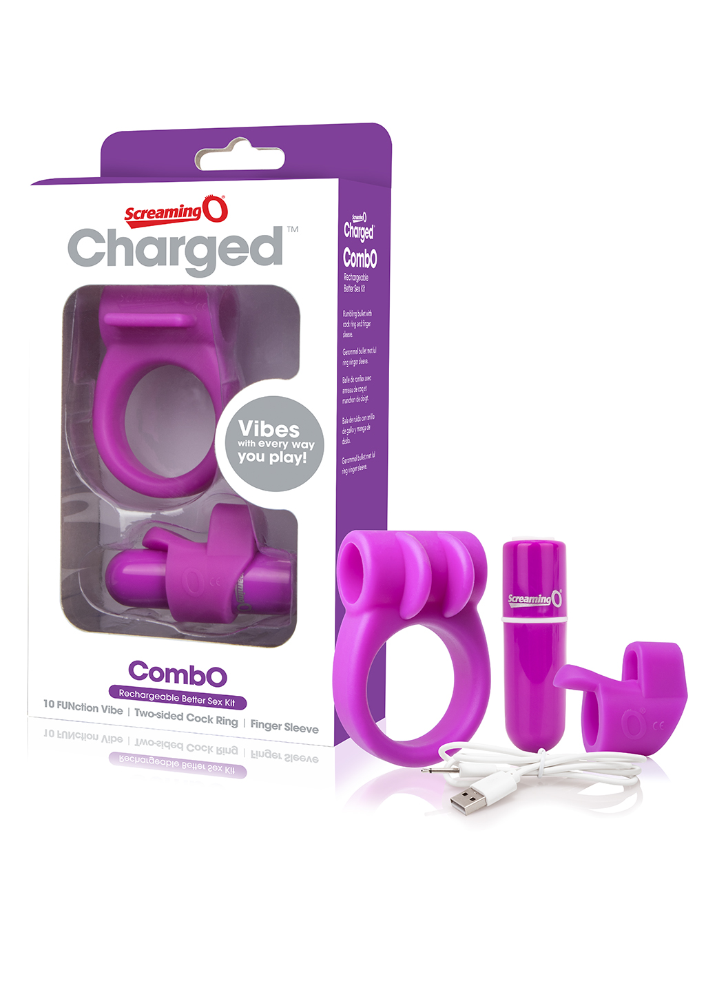 Enjoy all-in-one fun with Charged CombO, a complete better sex kit powered by deep, rumbling Vooom vibration. This convenient collection includes a stretchy two-sided cock ring and comfort-able fingertip sleeve – both made of body-safe True Silicone for the widest variety at a value price.