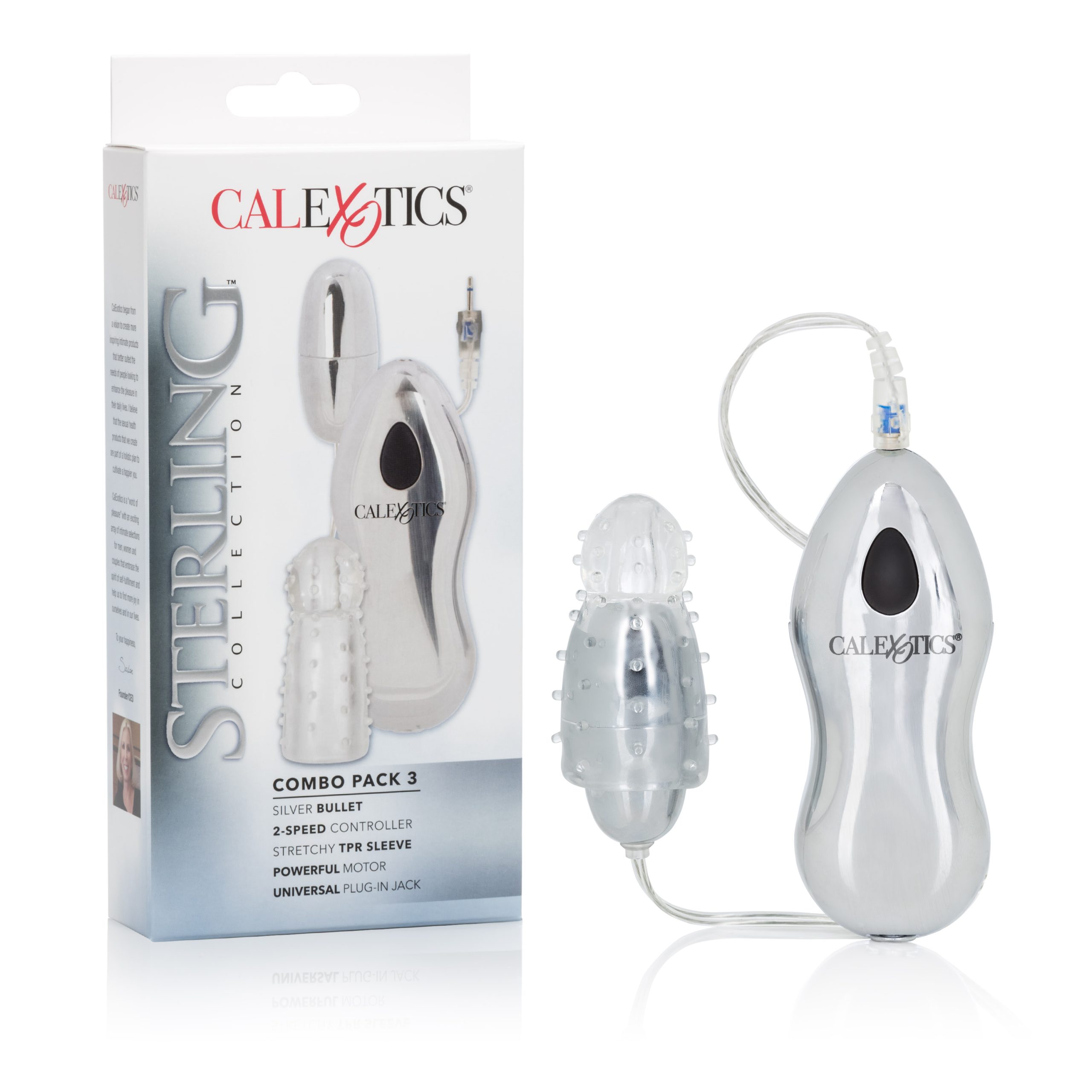 The Combo Pack is equipped with everything you need to indulge in heavenly-textured, powerfully charged, vibrating bliss. You’ll love the gleaming silver design that’s pure seductive allure. The controller’s carefully placed curves make switching speeds (or clenching it in your palm with ecstasy) an incredibly comfortable experience. Its single plug-in jack makes mixing and matching your stimulators simple. The bullet is packed with a wonderfully powerful motor for such a petite toy. Two speeds of vibrating, teasing, and pleasing sensation are at your service – massage your lips or tease your clit exactly the way that drives you wild. When you’re feeling creative, just plug the bullet into a new controller and explore an array of totally new sensations. And, when you feel like treating yourself to a totally fresh orgasmic experience, just slip on the super-soft and wonderfully stretchy bullet sleeve. It features bumps that’ll have you immersed in toe-curling pleasure in no time.