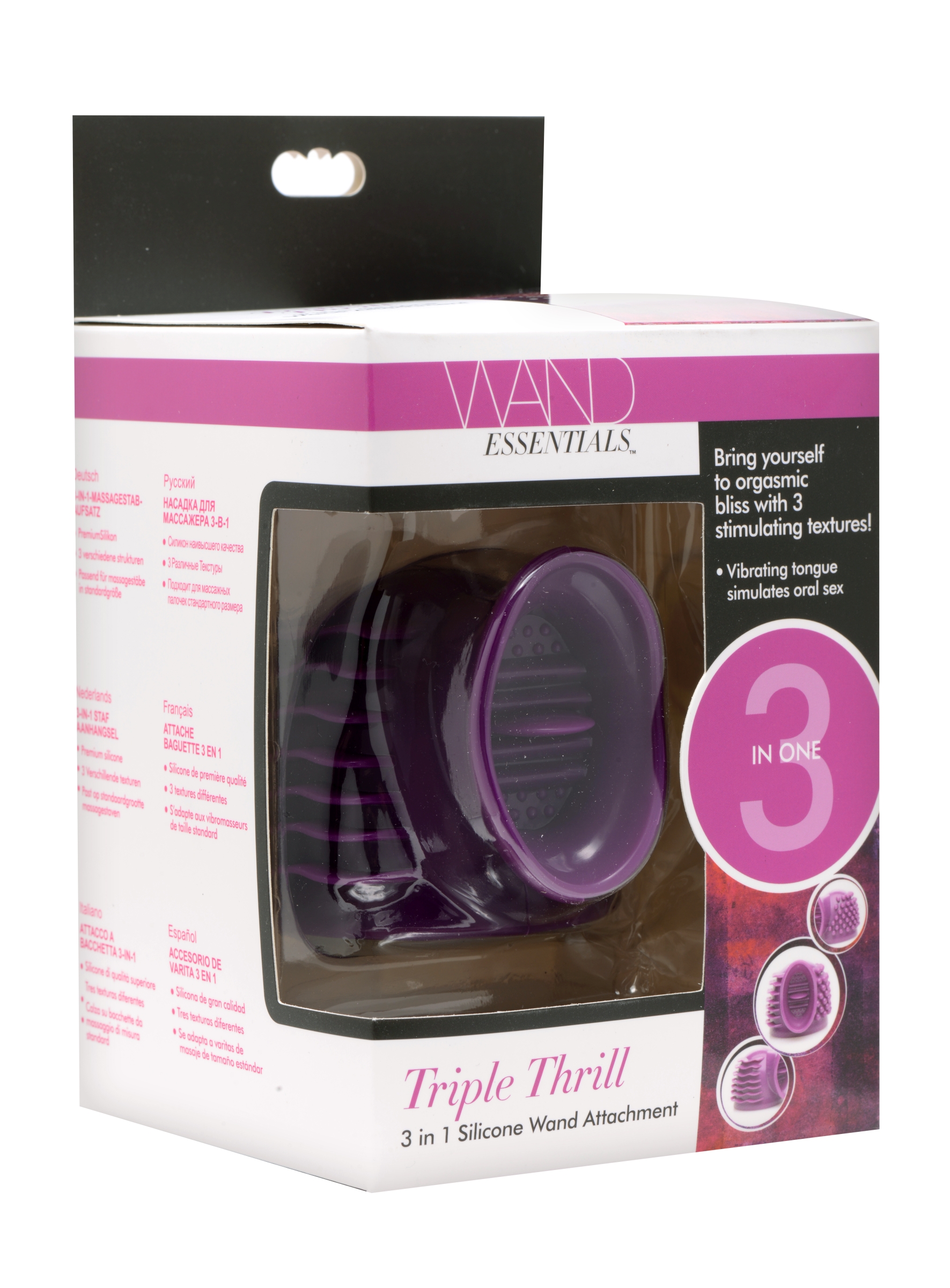 This 3-in-1 wand topper combines triple sensations with the powerful vibrations of your favorite wand massager! One side is adorned with a multitude of smooth nubs, the other side features wavy ridges. On the front of the attachment is a texture-filled cup. Inside, a small, flexible tongue will flicker. This wand topper is made of high-grade silicone so that it is phthalate-free and non- porous.