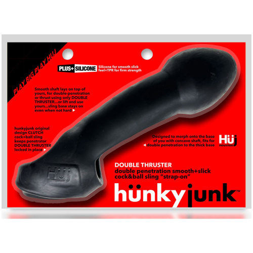 HunkyJunk original design clutch cock ball sling keeps penetrator Double Thruster lock in place. Sling base keeps it on for double penetration… or slide in it like a strap-on. Firm enough to use hard, squishy enough to fit right. Made of super-soft, smooth silicone blend.