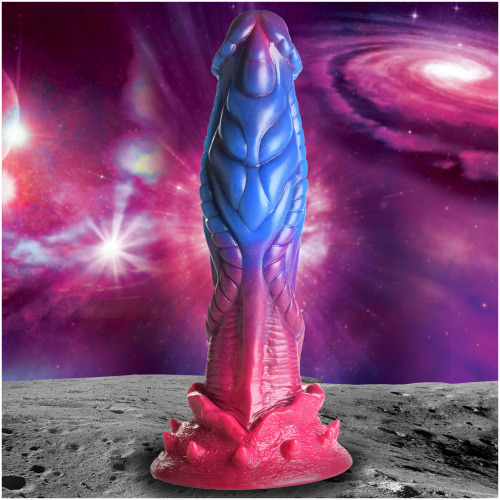 Imagine a fantasy lover with a cosmic cock. The brilliant and rich blue, purple and pink colors pop out amongst the darkness of the night. Look closer and you’ll see the glitter that mimics a star-filled sky. The round, phallic head is easy to pop inside. As you slide it in, enjoy the large bumps, the roped lines, and the thick ridge along the center. The numerous textures add scintillating stimulation as its girth and size open you up to expand your pleasure senses! Made out of premium, phthalate-free silicone, it is body-safe and best used with water-based lubricants. Firm yet flexible, it has a firm core and squishy outer layer that adapts to the curves of your body. The suction cup base can be placed on any flat surface for a hands free ocean exploration. Combine it with a strapon harness for couples fantasy roleplay. Use it in kinky cosplay and combine it with an outfit or costume!