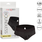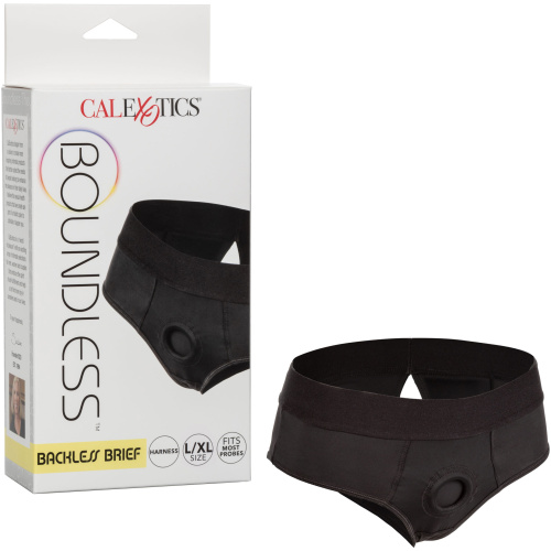 The Boundless™ Backless Brief is an ultra-comfortable harness fashioned like a a risqué backless brief with powerful performance and comfort in mind. This bold harness has an extra-wide waistband, soft stretchy fabric and reinforced O ring for the ultimate support. The durable, reinforced O-ring stretches to accommodate your favorite packer, vibrator or dildo. With a form-fitting design, this comfort harness can be worn discreetly under clothes. Enjoy pleasure made for two with the double panel interior for easy access to your favorite probe.