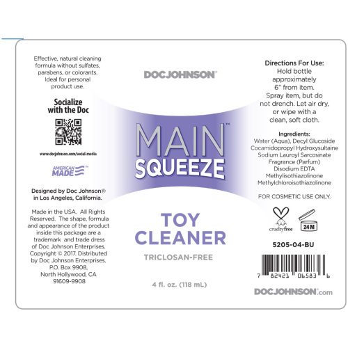The main Squeeze Toy Cleaner is a hygienic blend made without triclosan, sulfates, parabens, or colorants and is packaged in a convenient spray bottle for convenient application.