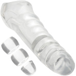 Cerafted with a stretchy and coomfortable transparent design, this extension kit accentuates your natural assets while maintaining a realistic feel. Its life-like hollow design is complemented by a built-in scrotum strap, adding stability to your experience. The inclusion of three stoppers allows for a tailored fit, catering to individual preferences and ensuring maximum comfort.