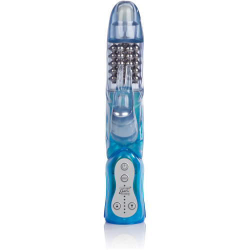 Advanced waterproof and multi-functional. Flickering bunny ears with 7 functions of independent vibration pulsation and escalation. 6 speeds of independent rotation. Non-jamming synchronized rotating beads. Easy push button controls with auto off button. EZ load battery case.
