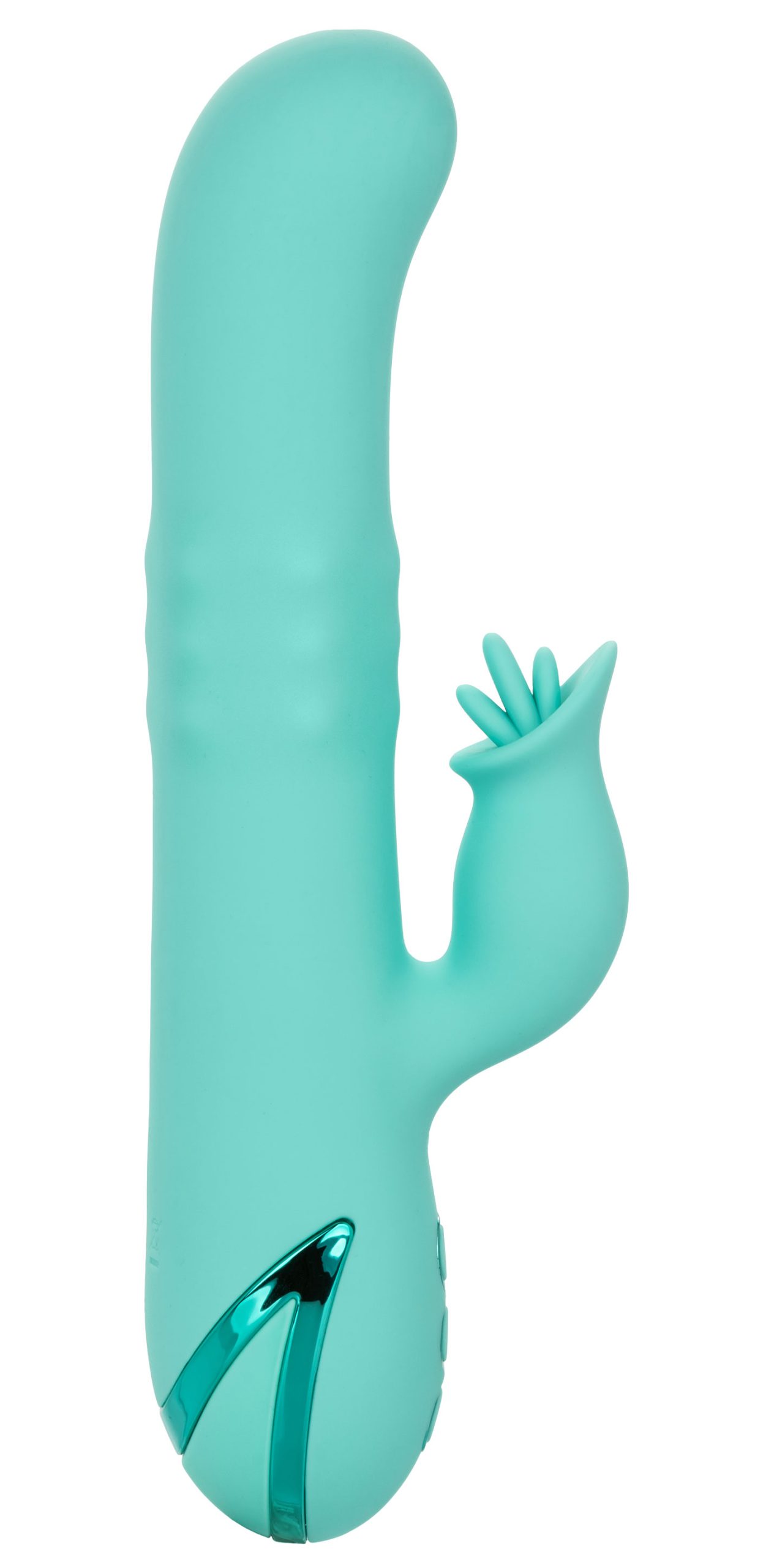 Dive deep into pools of pleasure and sun-kissed fantasies with the posh California Dreaming Bel Air Bombshell. The luxurious massager has 10 intense vibration functions, 3 independent shaft rotation functions and a unique triple teaser for one-of-a-kind pleasure experience. The seamless silicone body and flickering teaser put out knee-shaking stimulation in and out of the water. Whether you’re looking to turn up the heat with a lover or just enjoy some sensual solo time, this ravishing rabbit is ready. While contoured bunny teaser flickers and moves with your body, the 3 speeds of rotating beads in the shaft deliver thrilling g-spot stimulation. Control and customize your pleasure play with the independently controlled shaft rotation functions and teaser vibration functions. The knee-shaking gyrations packed into this playful vibe aren’t for the faint of heart! Triple power motors put out deep rumbling vibrations. Recharge the massager in 2.5 hours with the provided USB charging cable to enjoy 35 minutes of high-speed stimulation or 90 minutes of low speed vibrations. Enjoy frustration-free control with the easy-touch 3-button control pad and security lock feature for travel-ready teasing. The virtually seamless body and self-sealing charging port allow you to get this versatile waterproof vibe for a dip. The hypoallergenic premium silicone is body safe, unscented and phthalate free to keep your most sensitive spots, happy and healthy.