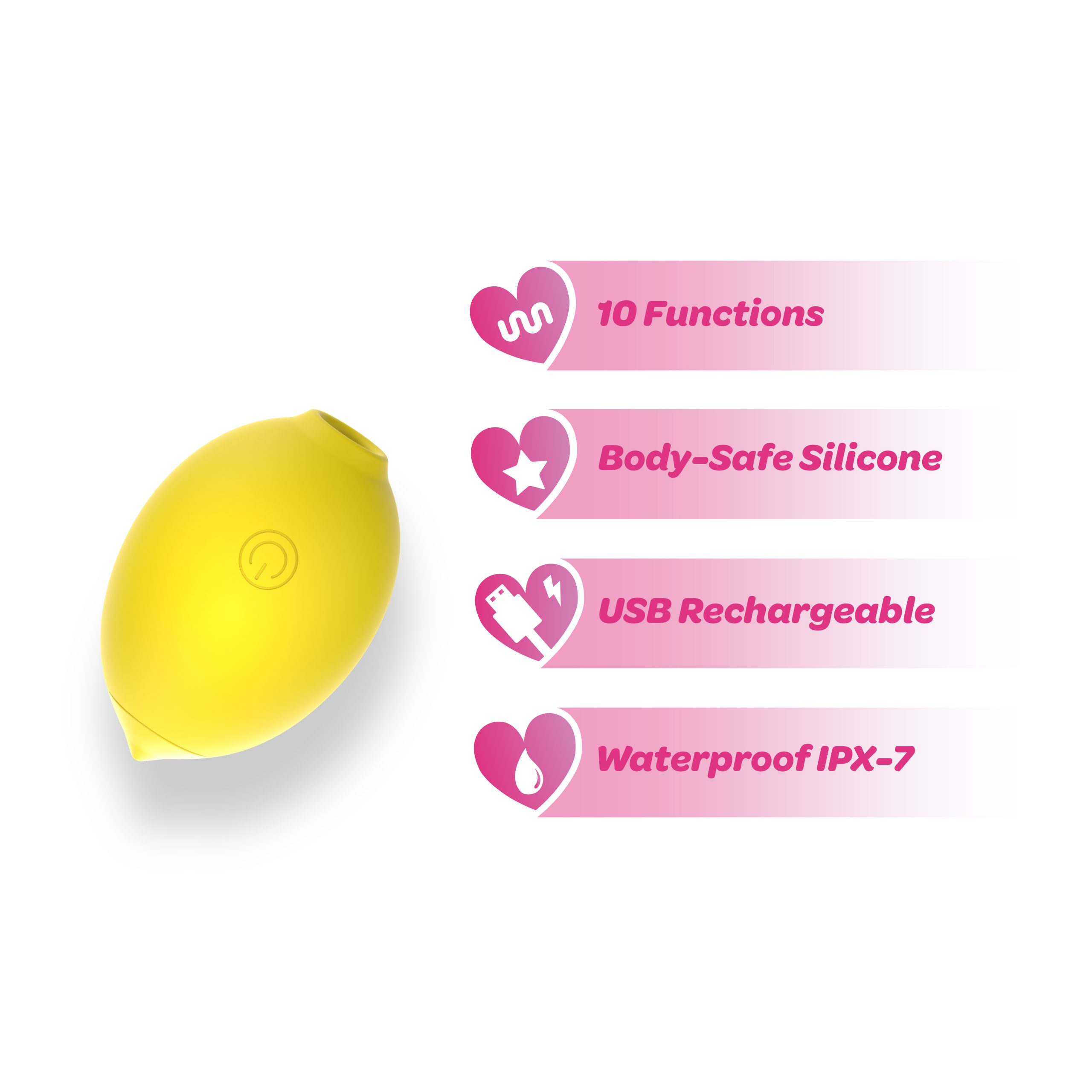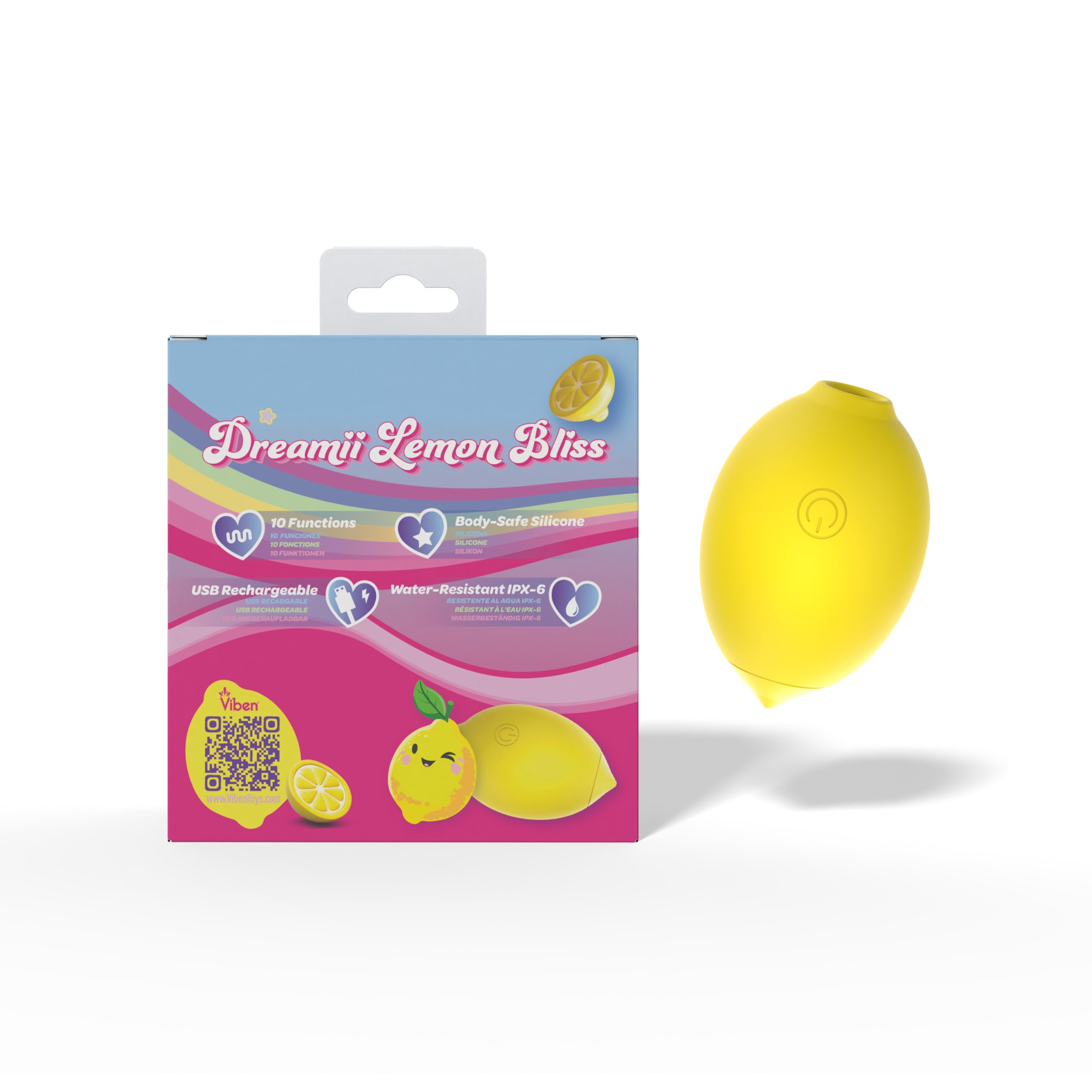 Introducing Lemon Bliss from the Dreamii Collection by Viben, a vibrant and playful pleasure toy inspired by the refreshing shape of a real lemon. Its cheerful, fruit-inspired design adds a burst of personality while remaining sleek and discreet. It is made from smooth, premium silicone, offering a soft, velvety texture that feels comfortable and inviting while maintaining the quality and durability Viben products are known for. Lemon Bliss combines stimulating vibration with suction, offering 10 intense vibration patterns and suction designed to create a variety of teasing and satisfying rhythms. From light fluttering pulses to deeper, more invigorating sensations, the different settings allow you to explore a range of experiences and discover the combination that feels just right.