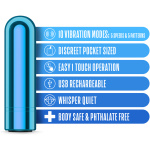 Get ready to vibe out with Kool Vibes. Flaunting a vibrant, blueberry-colored design this mini bullet adds a super playful pop to any collection. It’s a game changer for your pleasure, with a compact and travel friendly shape that’s fit for fun at home or on the go. Although small in size, this lil’ poket-sized vibrator packs a punch. You’ll love the 10 high performing vibration modes, that offer pinpoint clitoral stimulation from its guided, tapered tip. Cycle through 5 speeds and 5 patterns effortlessly with just one touch of a button, as waves of sensations fulfill your every desire. Kool Vibes has a smooth, sensual feel surface that feels amazing against your skin. With USB charging, it’s ready to power up and bring on the good times when you need it most. Perfect for solo use or with a partner for more advanced and creative play. Say goodbye to stress and hello to euphoric pleasure with this must have bullet vibe.