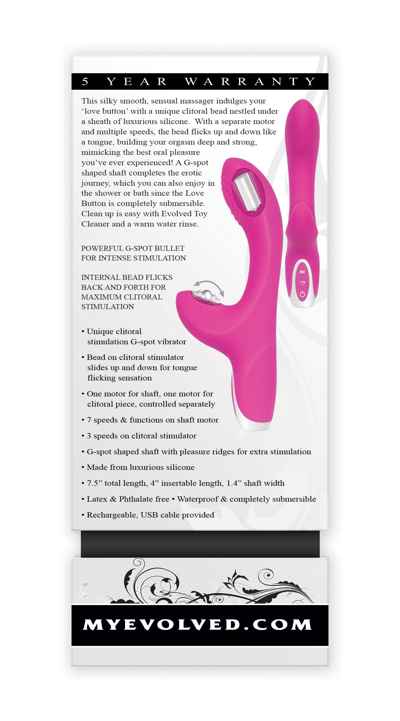 This silky smooth, sensual massager indulges your ‘love button’ with a unique clitoral bead nestled under a sheath of luxurious silicone. With a separate motor and multiple speeds, the bead flicks up and down like a tongue, building your orgasm deep and strong, mimicking the best oral pleasure you’ve ever experienced! A G-spot shaped shaft completes the erotic journey, which you can also enjoy in the shower or bath since the Love Button is completely submersible. Clean up is easy with toy cleaner and a warm water rinse.