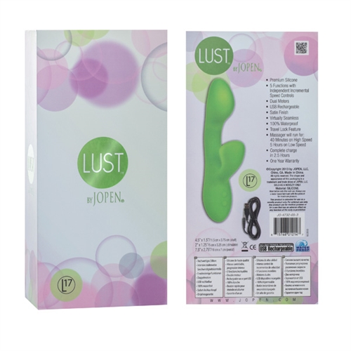 Dual motor silicone massager. Intensely powerful dual motors. 5 functions of vibration pulsation and escalation plus independent incremental speed controls. Rechargeable Lithium Ion battery. Complete charge in 2.5 hours. Unscented non-porous hypoallergenic. Virtually seamless Satin Finish Silicone. Auto on and off button with LED indicator light. Security travel lock function. Whisper quiet. 100 percent waterproof. Easy-to-clean. Universal USB cord included.