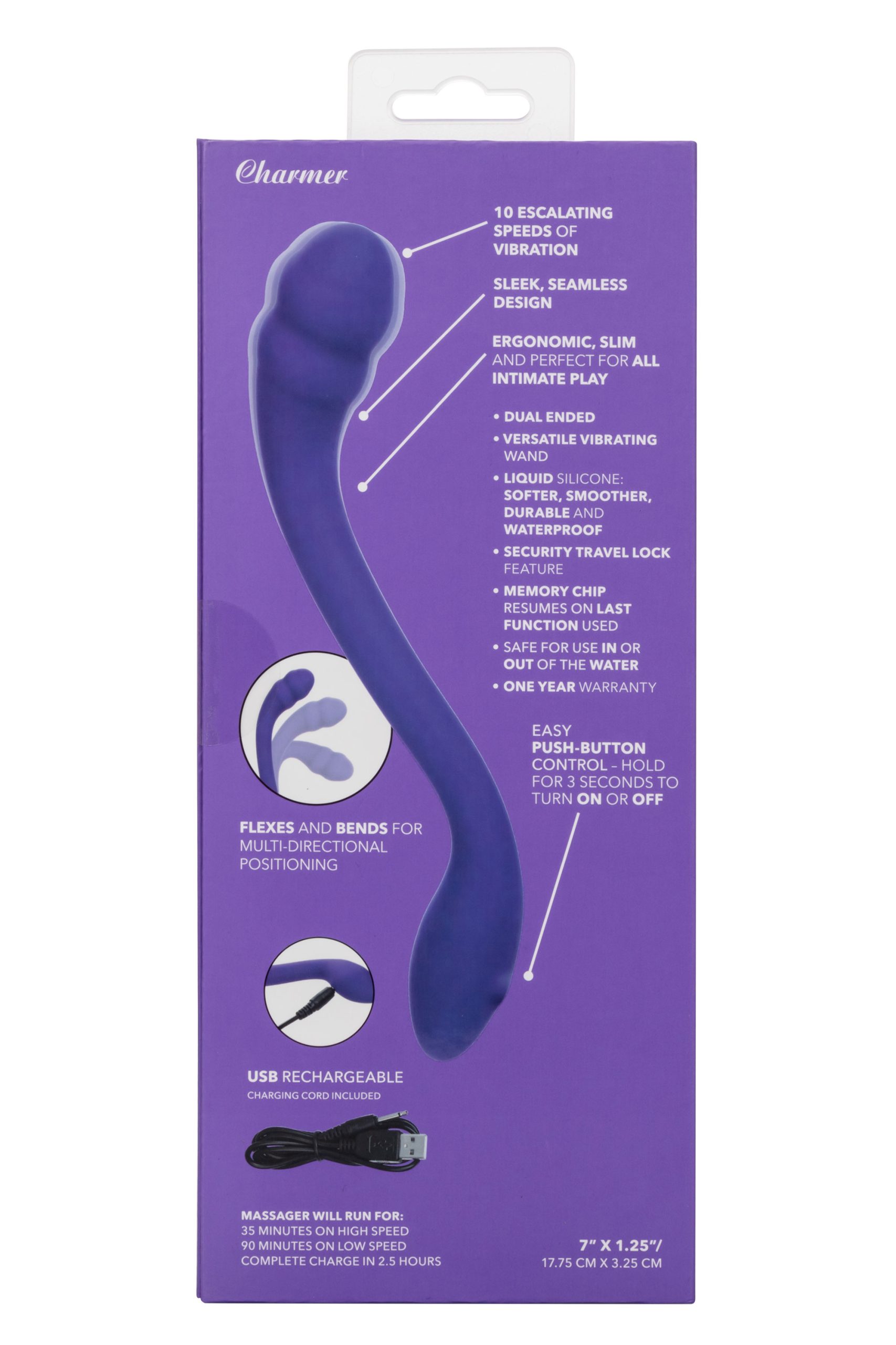 Indulge in your magical side and cast a spell for endless pleasure with the Pretty Little Wands Charmer. Thrust yourself towards new heights of pleasure with the unique slim massager complete with 10 speeds of vibration, a multi-directional flexible body, and indulgent dual ended design. Sure to hit just the right place, the flexible massager has multi-directional positioning to flex and bend into the perfect position. Get lost in pleasure alone or with a partner with the indulgent dual ended design. Up the intensity with 10 incremental speeds of vibration pulsating throughout the slim massager. While the easy-touch button controls the intensity and the vibe gives you the stimulation you want, the pliable body holds any position you desire. Recharge the premium silicone teaser in 2.5 hours with the provided USB charging cable to enjoy 35 minutes of high-speed stimulation or 90 minutes of low speed vibrations. The premium liquid silicone is made to be softer, smoother, and more durable than you’’ve ever experienced before. A state of the art memory chip remembers just how you like it by resuming on the last function used when turning back on.