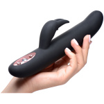 Experience a blended orgasm from the blissfully buzzing bunny against your clitoris and the smooth-as-silk shaft that simulates a Come-Hither motion against your sweet spot. This premium silicone vibrator features 3 speeds of thrumming and 7 patterns of throbbing, as well as an ample shaft that flexes up and down to stroke your G-spot with 3 speeds of its own. The elegant gem-adorned control panel is simple to use. A protruding bunny nose will pinpoint your clit for vibration, while the ears will flutter around it for an entirely different sensation. This pleasure tool is magnetically rechargeable and waterproof so that you can treat yourself in the bath or shower. The phthalate-free material is non-porous for an easy clean with mild soap or toy leaner. Avoid use with silicone lubricants.