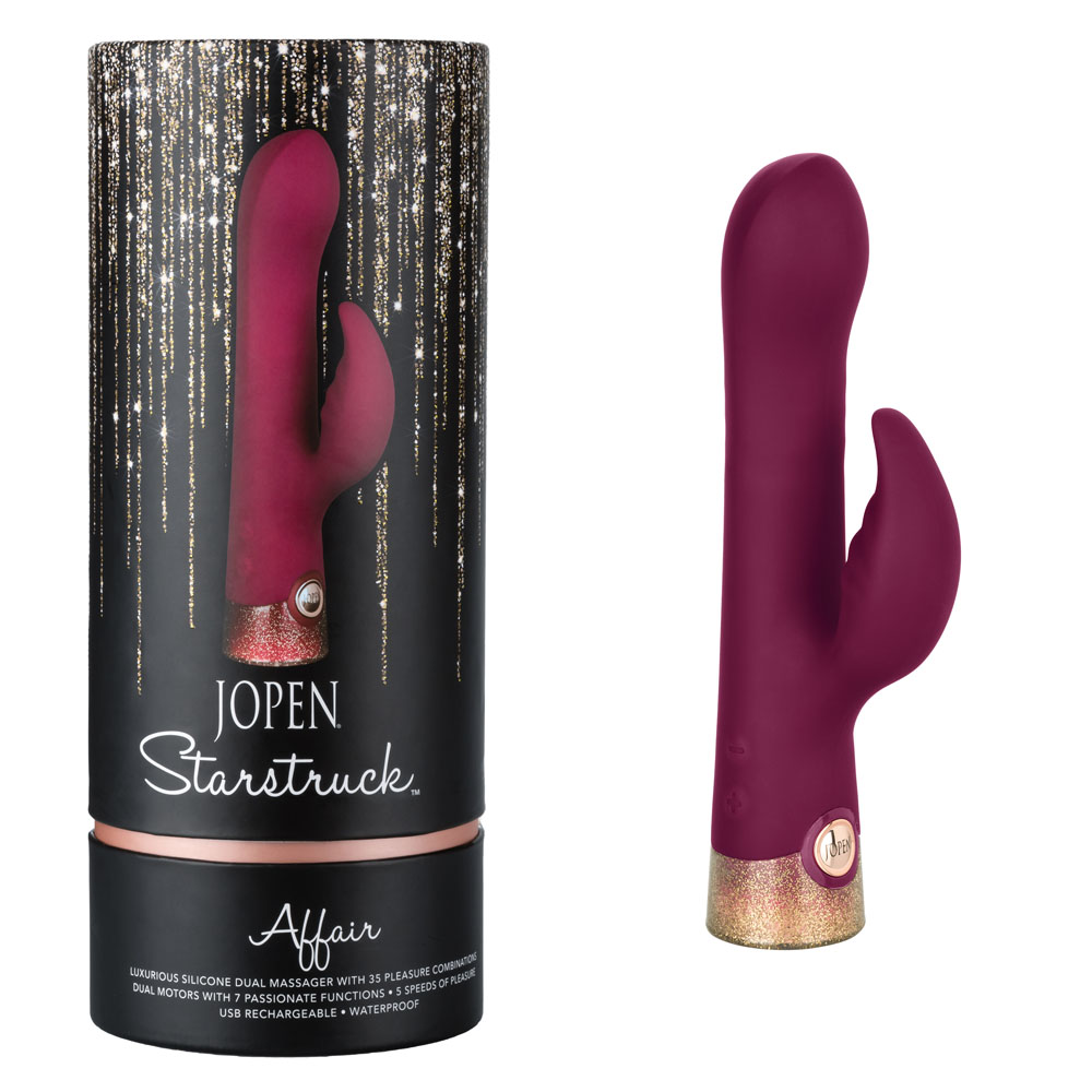 Give yourself over to a sensual love affair with the flexible Jopen® Starstruck Affair. This deep rumbling beaded rabbit thrills with a rotating shaft, flickering teaser and 35 functions of vibration.