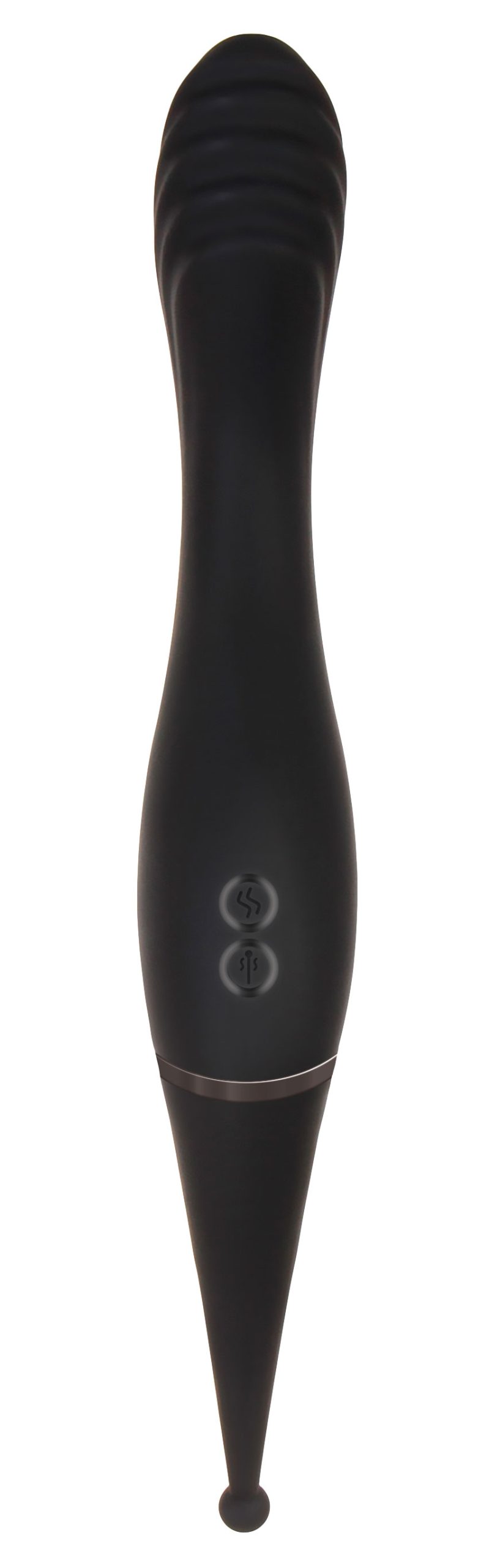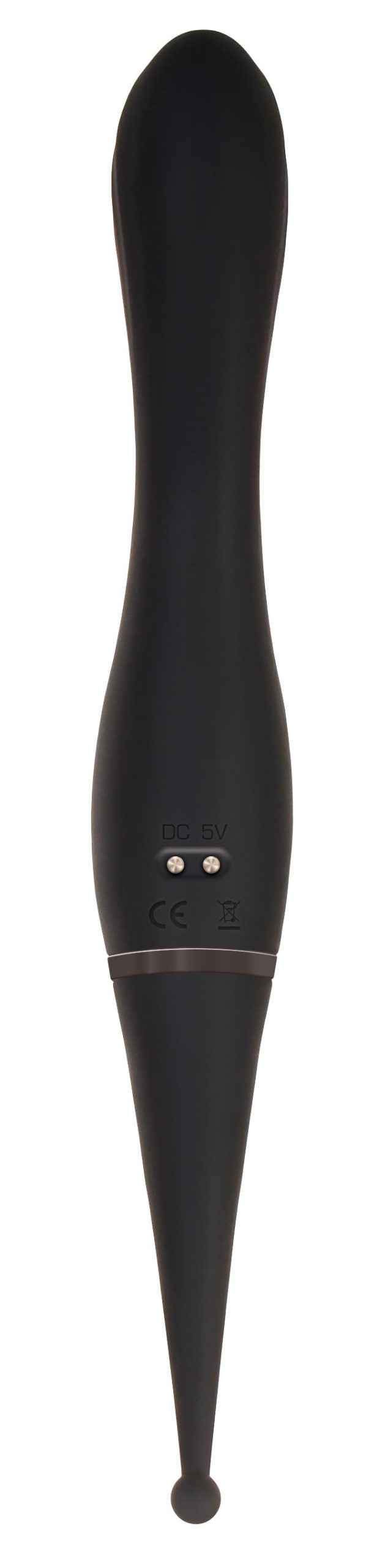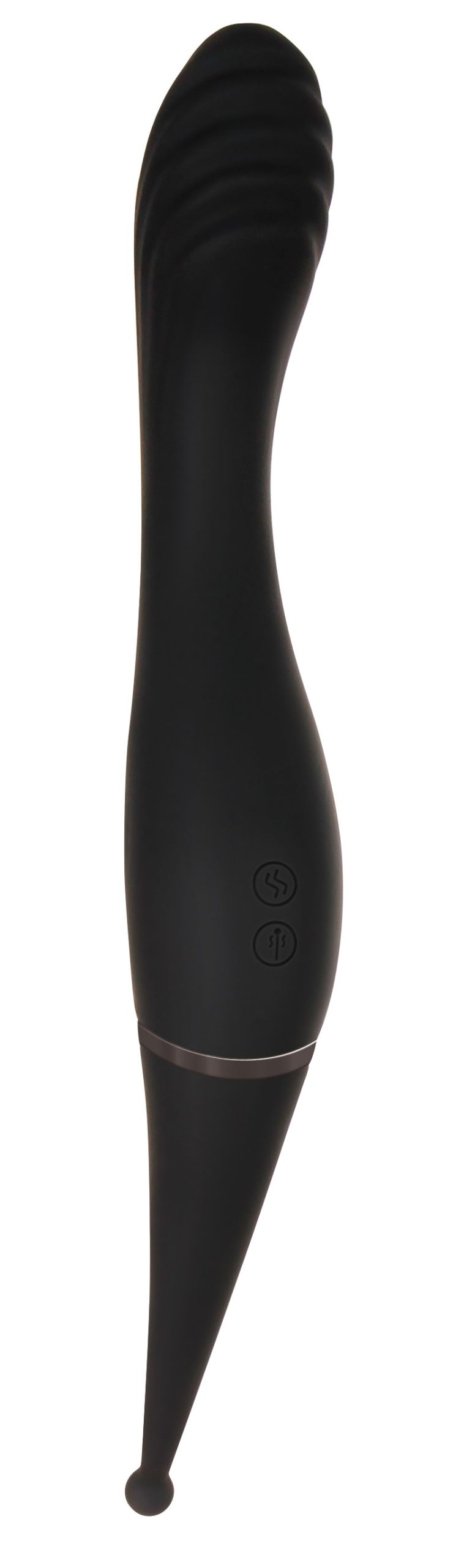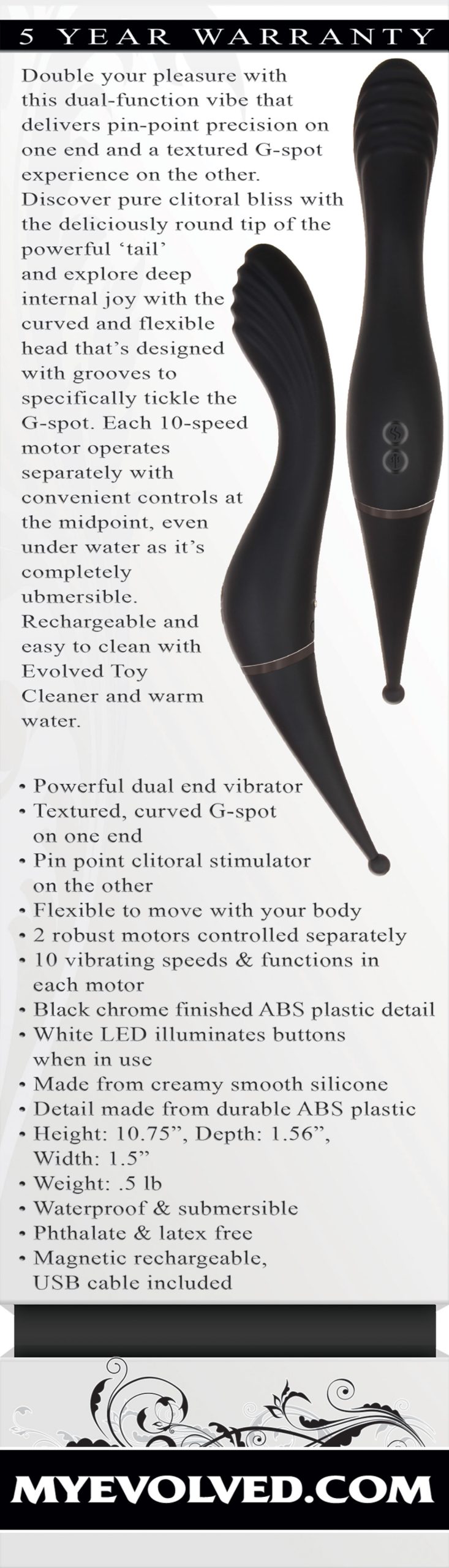 Double your pleasure with this dual-function vibe that delivers pin-point precision on one end and a textured G-spot experience on the other. Discover pure clitoral bliss with the deliciously round tip of the powerful ‘tail’ and explore deep internal joy with the curved and flexible head that’s designed with grooves to specifically tickle the G-spot. Each 10-speed motor operates separately with convenient controls at the midpoint, even under water as it’s completely submersible.