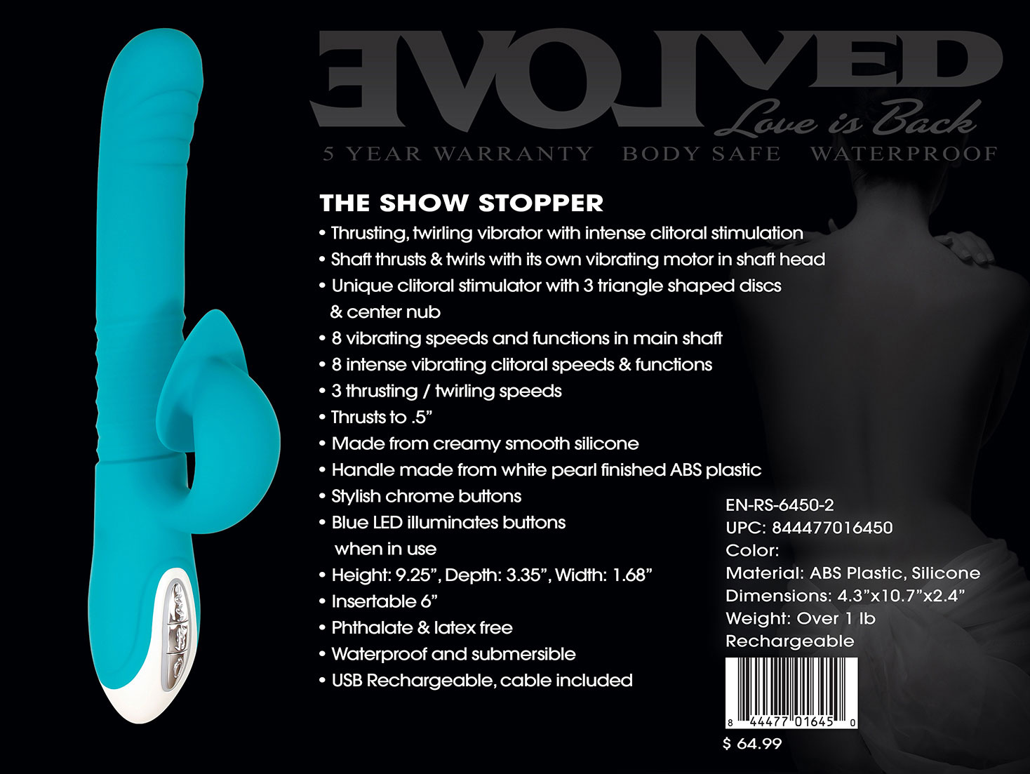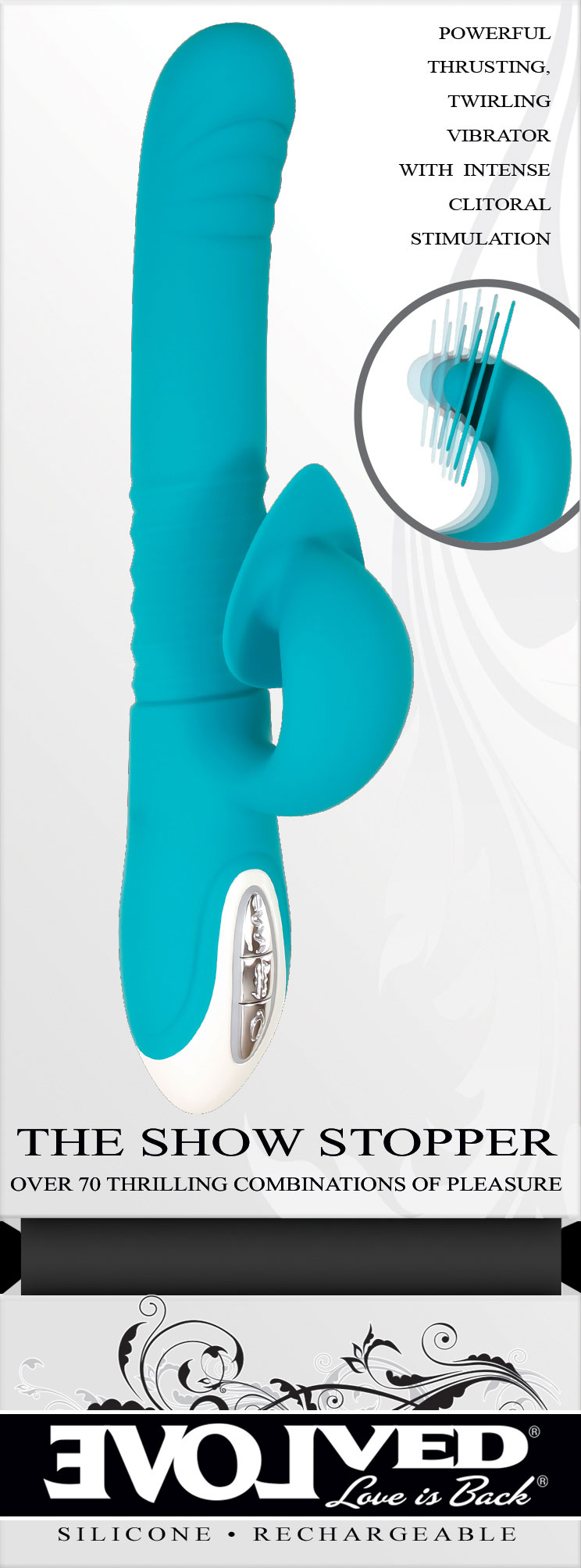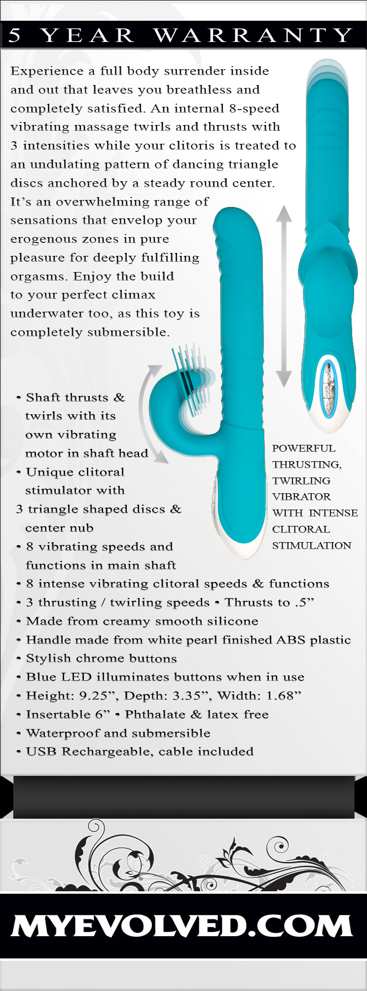 Experience a full body surrender inside and out that leaves you breathless and completely satisfied. An internel 8-speed vibrating massage twirls and thrust with 3 intesifies while your clitoris is treated to an undulating pattern of dancing triangle discs anchored by a steady round center. It’s an overwhelming range of sensations that envelop your erogenous zones in pure pleasure for deeply fulfilling orgasms. Enjoy the build to your perfect climax underwater too, as this toy is completely submersible.