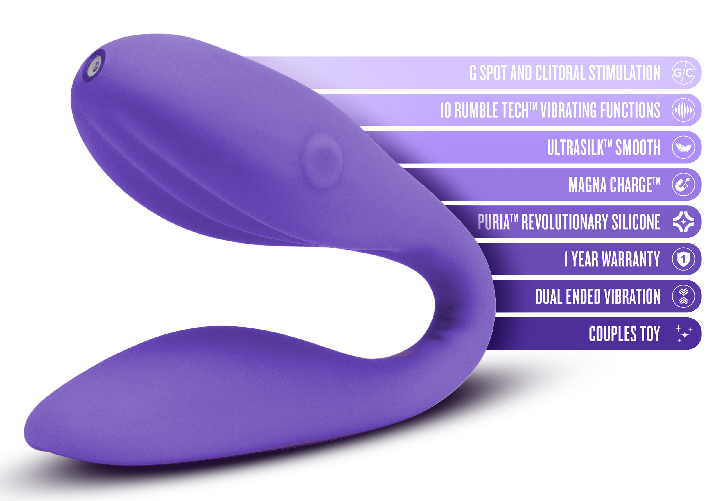Ideal for solo play, ideal for partner play: the Wellness Duo is a versatile couples vibrator. Its flexible body will bend with yours, for extra G-spot plus clitoral stimulation during penetrative sex. Or, Duo’s 10 powerful functions will shine as you use it as a straight vibe, either inside or outside your body. Duo is rechargeable, plus waterproof submersible for easy cleaning or play in the bath or shower! Ultrasilk smooth and made of puria silicone, the Wellness Duo is body-safe, phthalate free, latex free, and easy to clean.